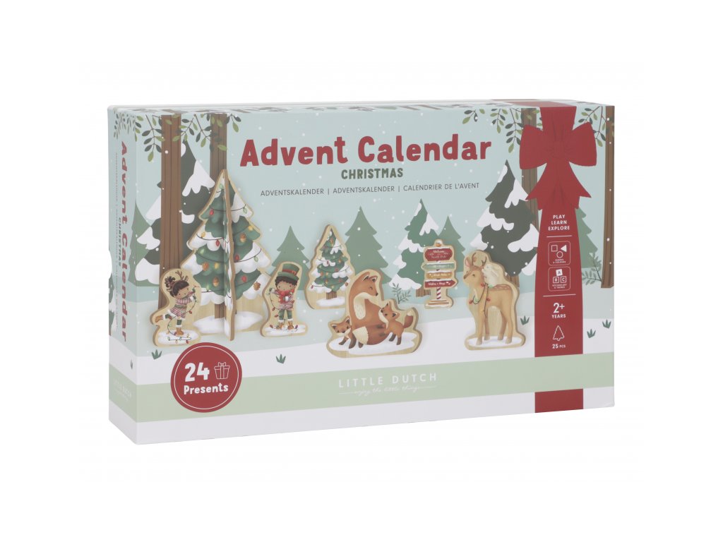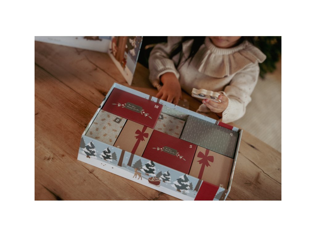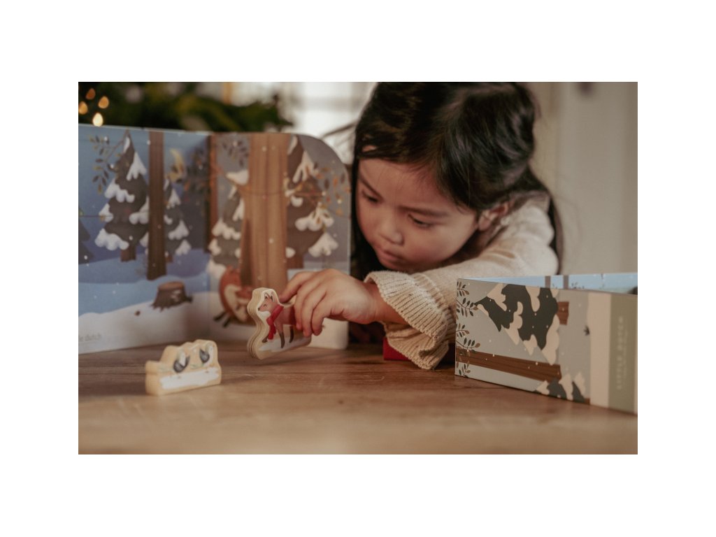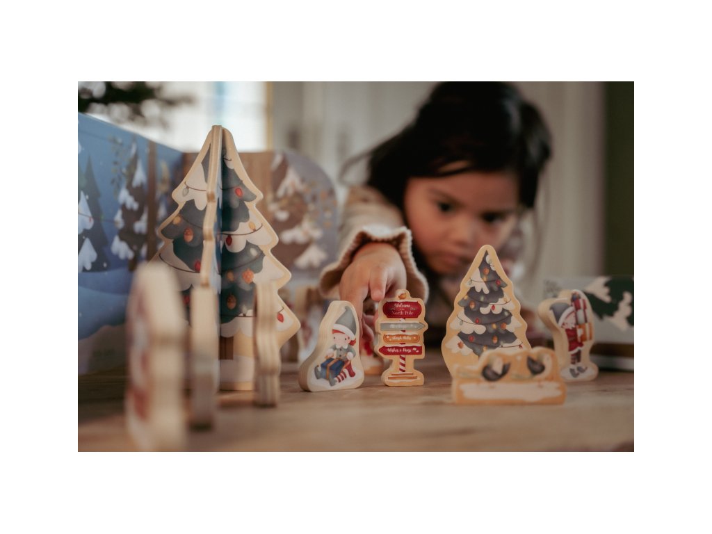 Originální adventní kalendář zpříjemní celé vaší rodině čas těšení se na Vánoce. Užijte si spolu s vaším dítětem krásné adventní období, které je ideální pro vyprávění příběhů a snění o bílých Vánocích. Kalendář je tvořen 24 balíčky, ze kterých si dítě postupně sestaví vlastní vánoční vesničku. Oboustranný pevný kartonový díl s krásnými ilustracemi nabízí pozadí zasněženého lesa ve dne a v noci. Každý balíček obsahuje dřevěnou postavičku, zvířátko, zasněžený strom, sáňky, sněhuláka apod. s krásným oboustranným potiskem. Adventní kalendář je opakovaně použitelný a potěší vás i vaše děti každé Vánoce. Rozměry: 34 x 22 x 75 cm Vhodné pro děti od 2 let.