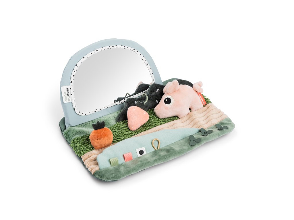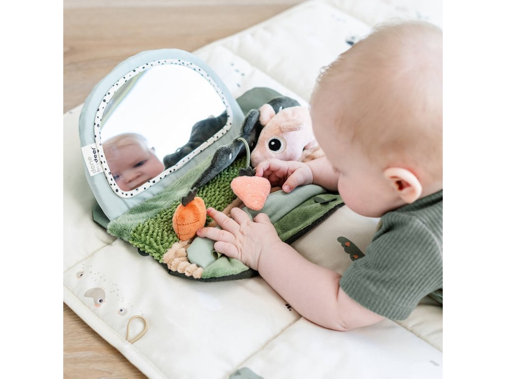 Malé děti baví jejich vlastní odraz, díky kterému je podlahové zrcadlo ideální pro povzbuzení trénování pozice na bříšku. Mnoho senzorických funkcí je povzbudí k delšímu a aktivnějšímu pobytu na břiše. Zrcadlo Tiny farm je navrženo se smyslovými aktivitami, jako jsou barevné štítky, hmatové textury, zvuky - je toho tolik, na co se dívat a zkoumat.
