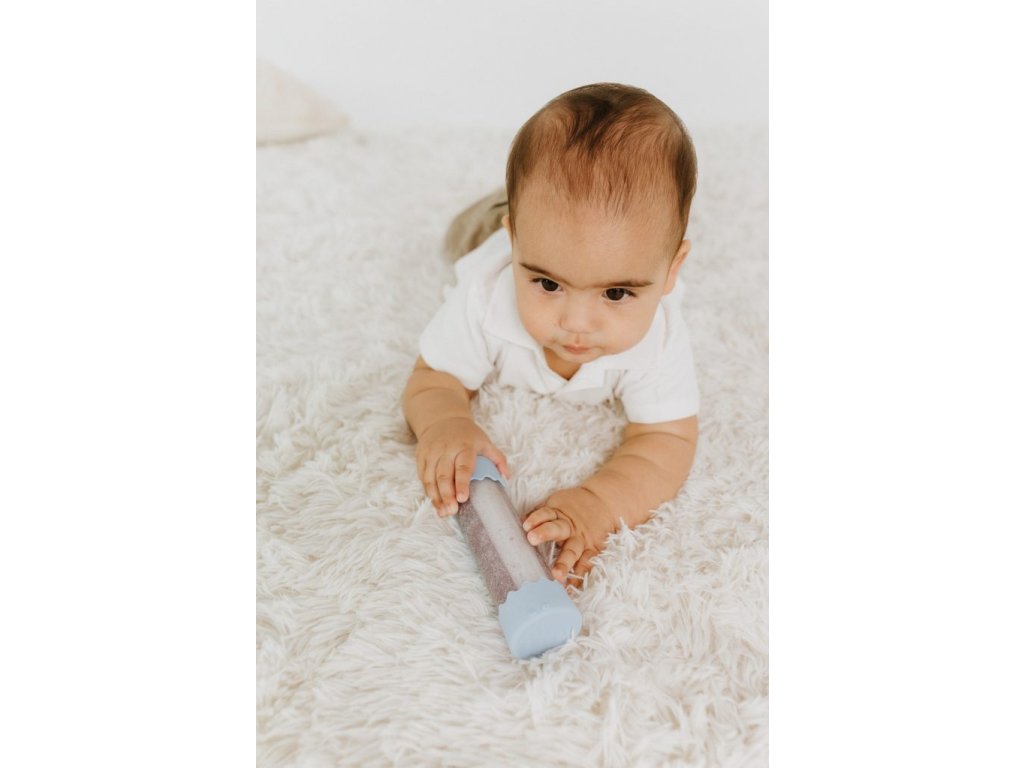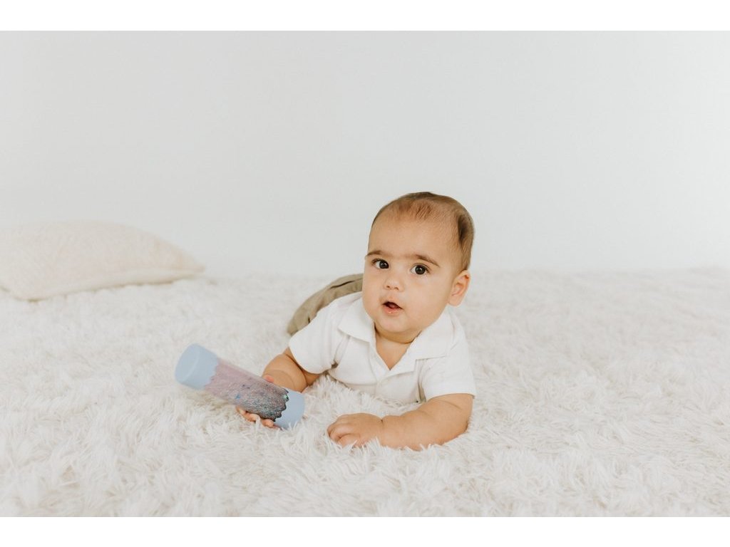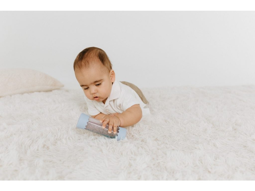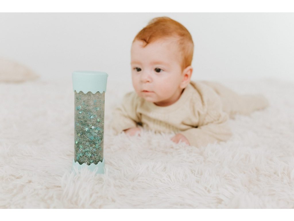 Děti fascinuje víření třpytek a flitrů uvnitř lahve. Sledování poletujících třpytek je perfektní aktivita pro čas strávený na bříšku. Později si miminka mohou lahvičku kutálet sem a tam po hrací podložce a rozvíjet tak pohybové dovednosti či koordinaci smyslů a pohybů ruka-oko.