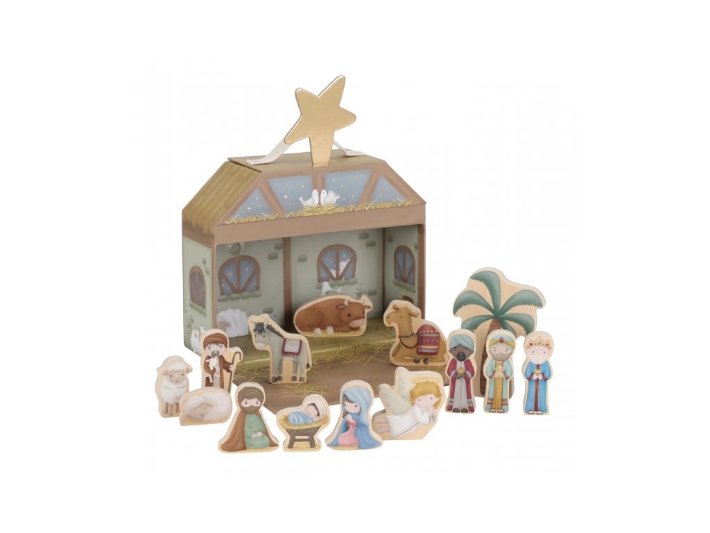 14 postaviček je vyrobeno ze dřeva, chlév z kvalitního pevného kartonu slouží i jako přenosný a úložný kufřík.