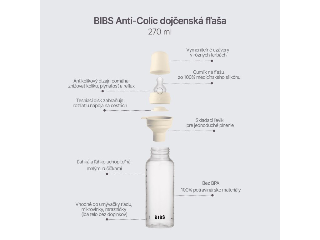 MIX & MATCH: Kromě kompletní kojenecké láhve, která obsahuje vše potřebné pro pohodlné krmení (láhev, dudlík, objímku, víčko, těsnicí disk a trychtýř), můžete zakoupit i samostatné náhradní láhve (150 ml nebo 270 ml) a sady uzávěrů na láhve (objímka, víčko, těsnicí disk v různých barvách). Skládejte si láhev podle potřeb vašeho dítěte a vašich preferencí. BIBS samozřejmě nabízí i náhradní dudlíky v kaučukovém a silikonovém provedení s různými průtoky (pomalý, střední, rychlý).