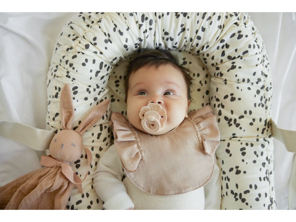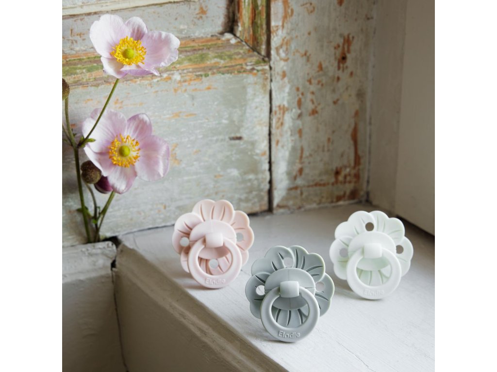 Krásný dudlík ve tvary kytičky. Vhodný pro děti od 3 měsíců, sací část je vyrobena z kaučuku a má zploštělý tvar. Dudlík nelze vyvařovat. Jen propláchněte vařící vodou. Vyhovuje evropskému bezpečnostnímu standardu EN-1400:2013 + A2:2018.