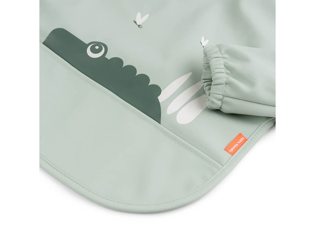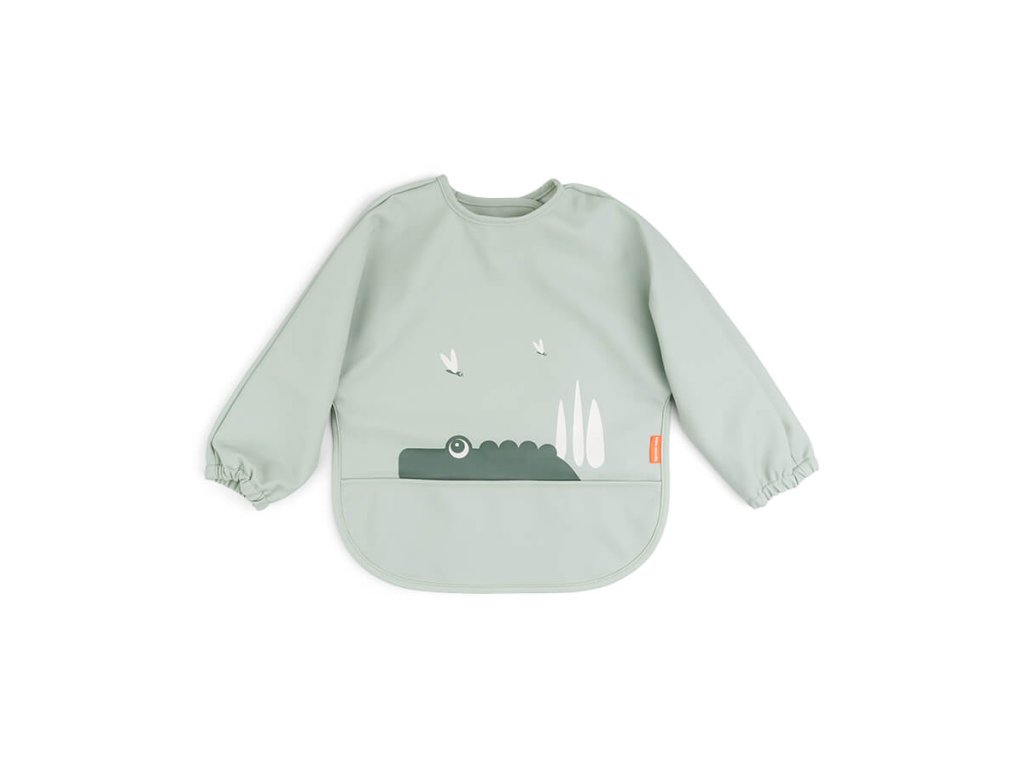 Bryndáček s kapsou a rukávem ochrání Vašeho malého jedlíka při jídle nebo když je čas na kreativitu s malováním, hraním a podobně. Nastavitelné dvojité zapínání zajišťuje, že bryndáček padne miminkům i batolatům. Měkký bryndáček je voděodolný s praktickými elastickými rukávy, které udrží vaše děťátko v suchu. Bryndáček se snadno čistí, což Vám ušetří spoustu času při úklidu! Roztomilý bryndáček zdobí kamarád Croco a dekorativní vodní rostliny.