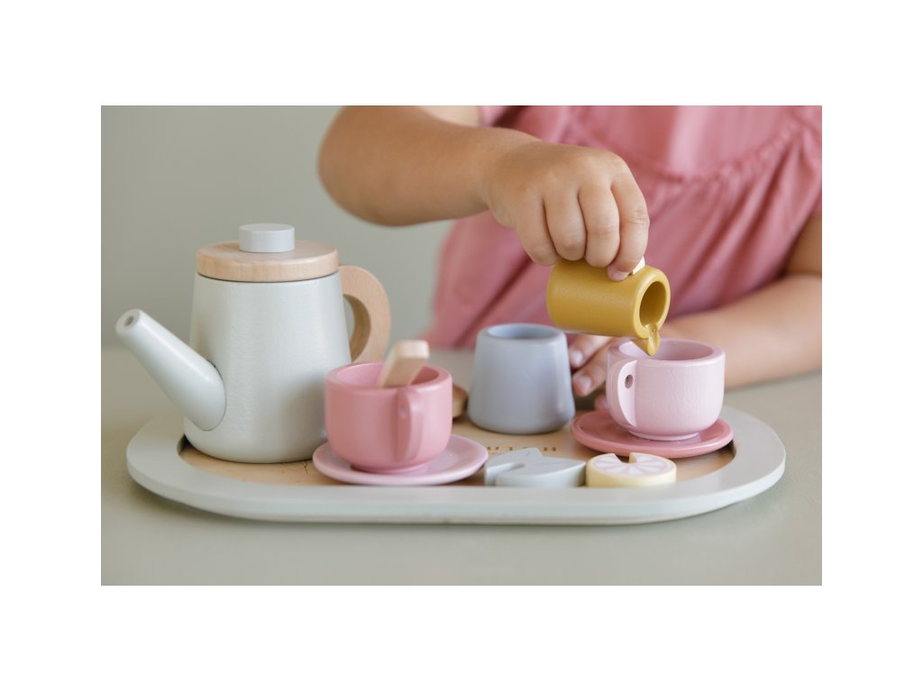 Dáte si čaj? S touto roztomilou dřevěnou čajovou soupravou může vaše ratolest podávat šálek lahodného čaje s mlékem, cukrem nebo plátkem citronu či snítkou máty. Máte všechny ingredience pro zábavné čajové odpoledne s přáteli. Obsah balení: dřevěná konvička s poklicí, konvička na mléko, cukřenka s pokličkou, tác, 2 šálky, 2 podšálky, 2 lžičky, 1 plátek citronu, 1 lístek máty Rozměry: 27,4 x 17,9 x 9 cm Vhodné pro děti od 2 let.Doplňkové parametry