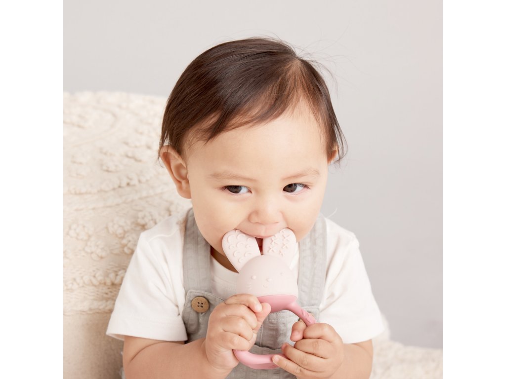 Měkká silikonová hlava a ouška králíčka se dostanou do všech oblastí pusinky dítěte. Texturovaný silikon poskytne při žvýkání masáž a úlevu dásním a dítě navíc zkoumá nové textury a tvary.