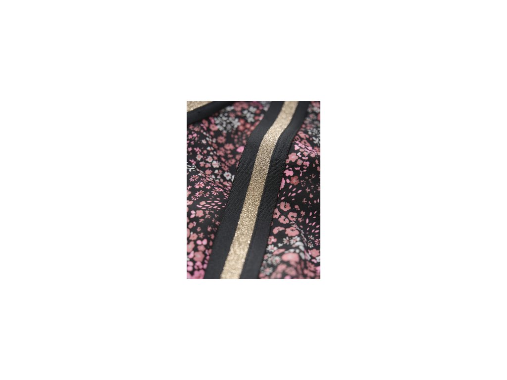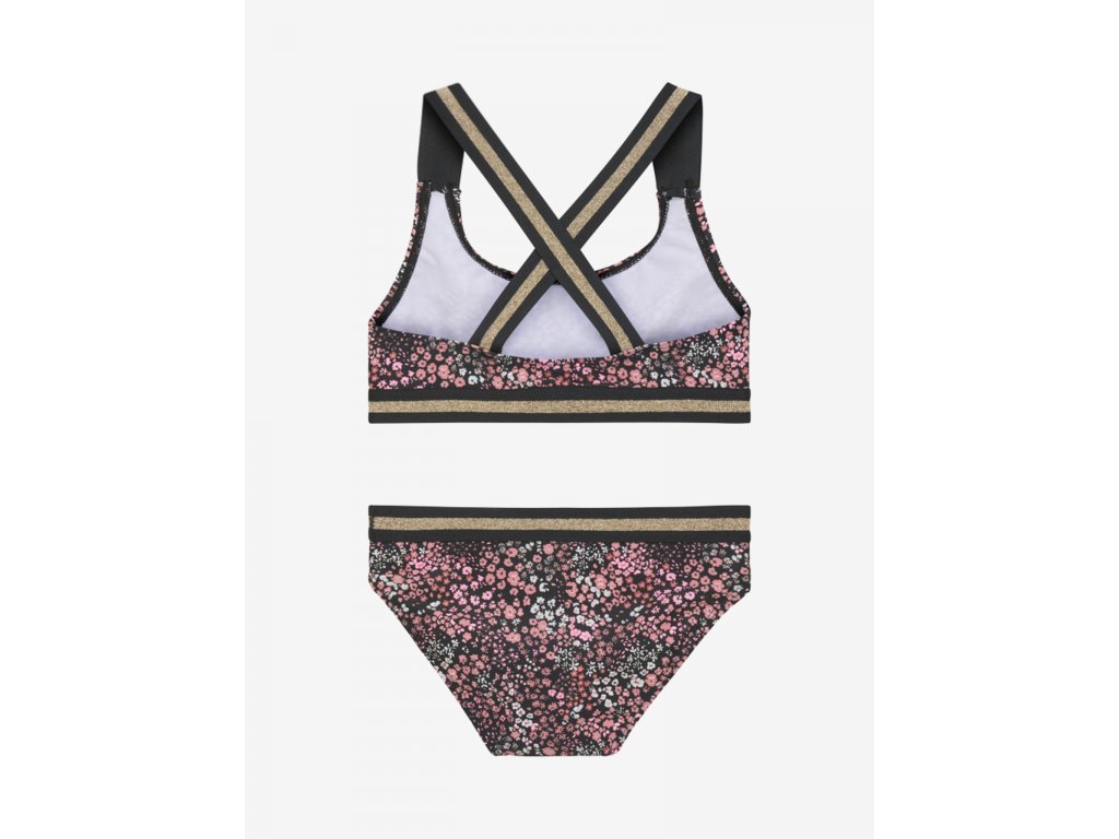 Dívčí dvojdílné dílné plavky s černým podkladem a potiskem růžovo-červených květů.