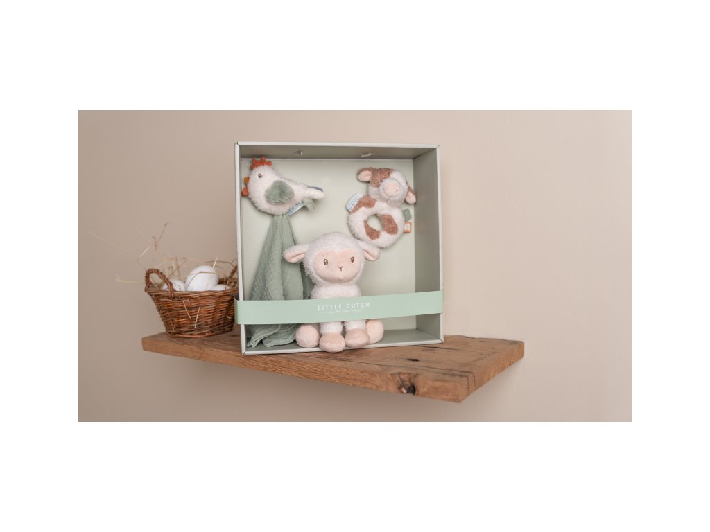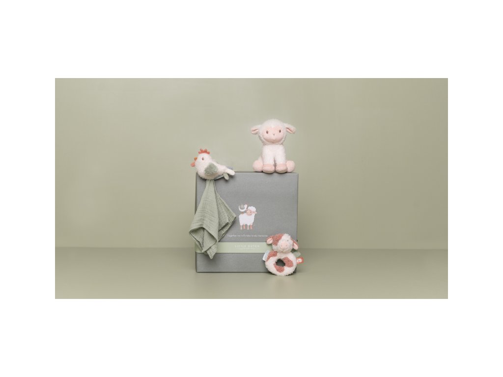 Krásná dárková sada plyšových hraček je ideální jako dárek pro novorozené miminko. Sada obsahuje chrastítko v podobě kravičky, muchláčka se slepičkou a plyšovou ovečku. Sada je součástí designové kolekce hraček Little Dutch Farma. Rozměry krabice: 28,5 x 28,5 x 11 cm Vhodné pro děti od narození.