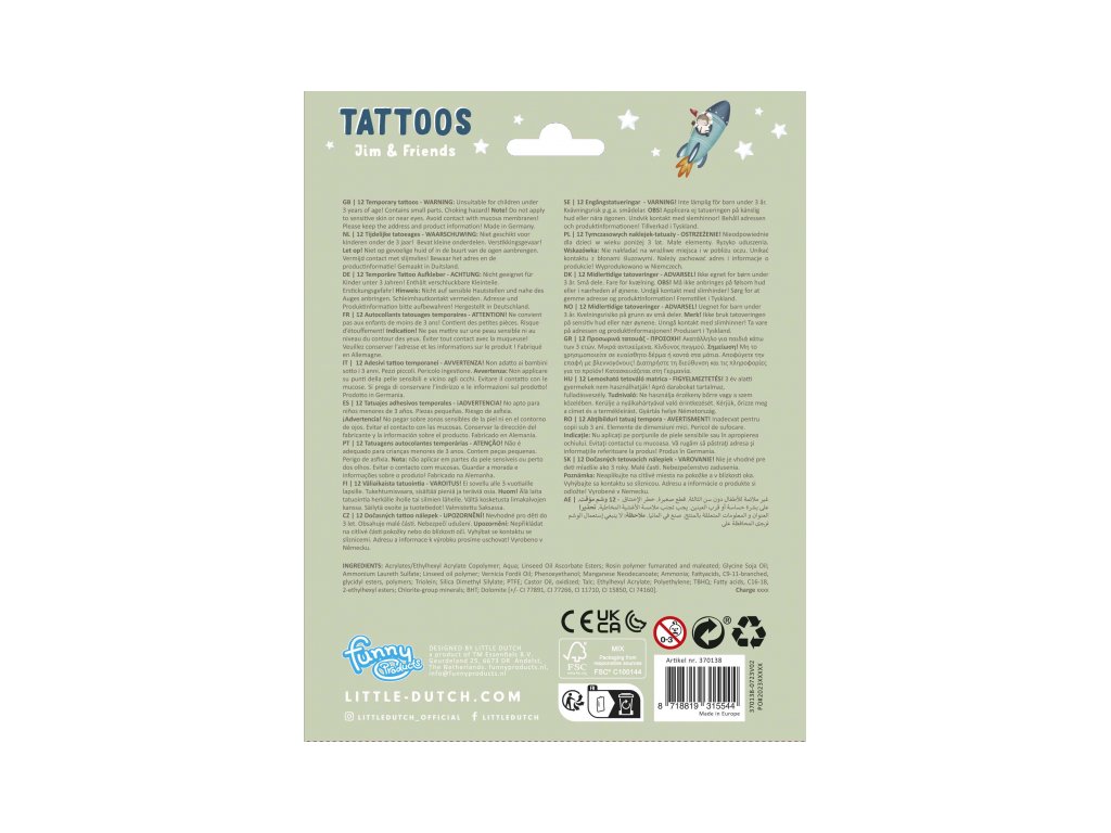 Dočasné dětské tetování s krásnými motivy Jima a různých dopravních prostředků a zvířat. Samolepicí tetování se snadno aplikuje s pomocí vlhké houbičky. Arch obsahuje 12 ks tetovaček. Vhodné pro děti od 3 let.