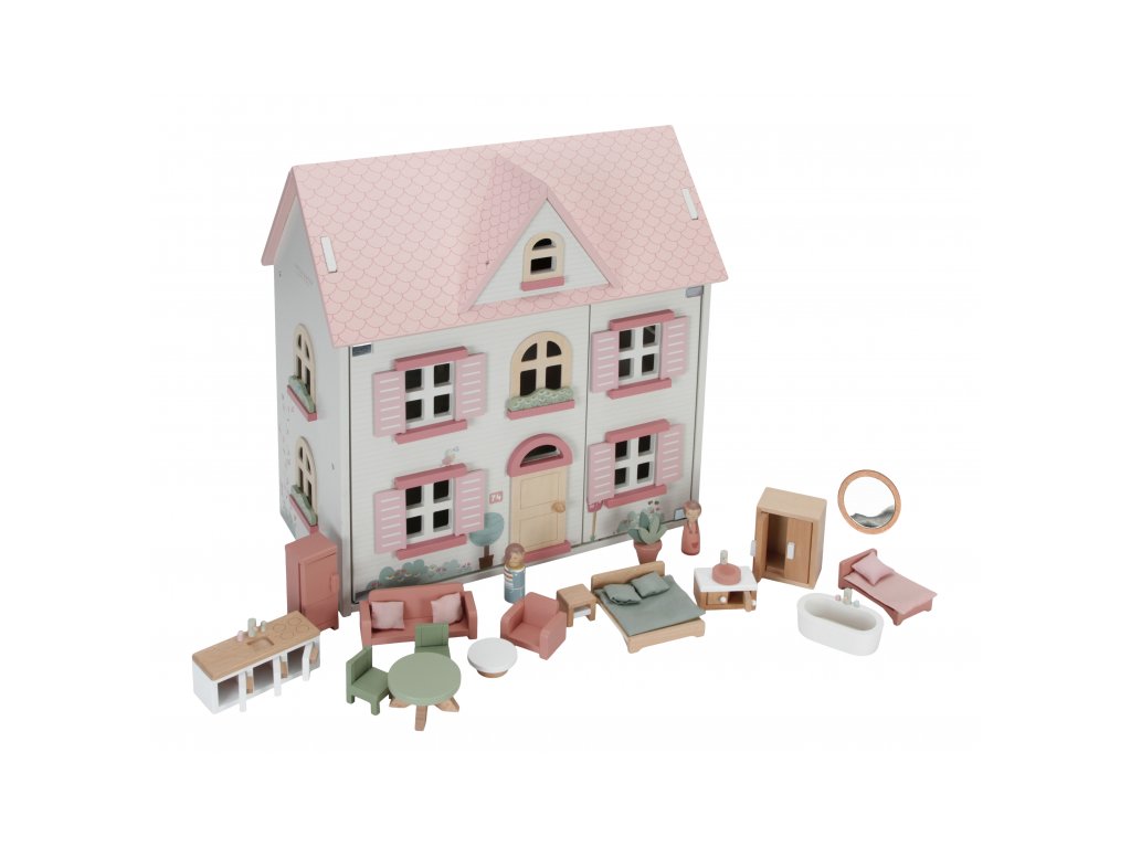 Krásný dřevěný domeček pro panenky Little Dutch poskytne vašim dětem nekončící hodiny zábavy a zároveň prostor pro rozvoj fantazie a kreativity. Dům v bílé barvě s růžovou střechou má otevírací dřevěné okenice. Střechu lze také otevřít a část střechy lze proměnit v zahradu. Interiér domu je velmi detailní a zdobený krásnými ilustracemi. V domečku najdete dvě dřevěné panenky Jima a Rosu, obývací pokoj, kuchyň, koupelnu, ložnici a dětský pokoj. Každý pokoj je zařízen odpovídajícím nábytkem a doplňky. K domečku je možné dokoupit další sady nábytku, domází mazlíčky apod. Rozměry: 49 x 43 x 22,5 cm Vhodné pro děti od 3 let.