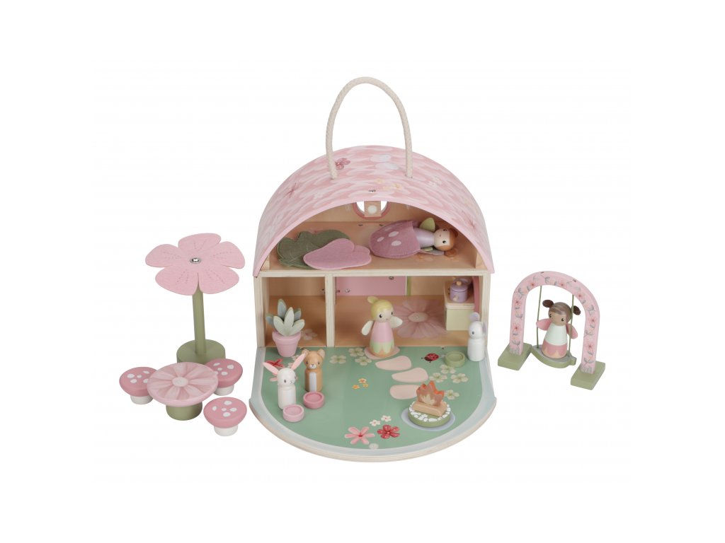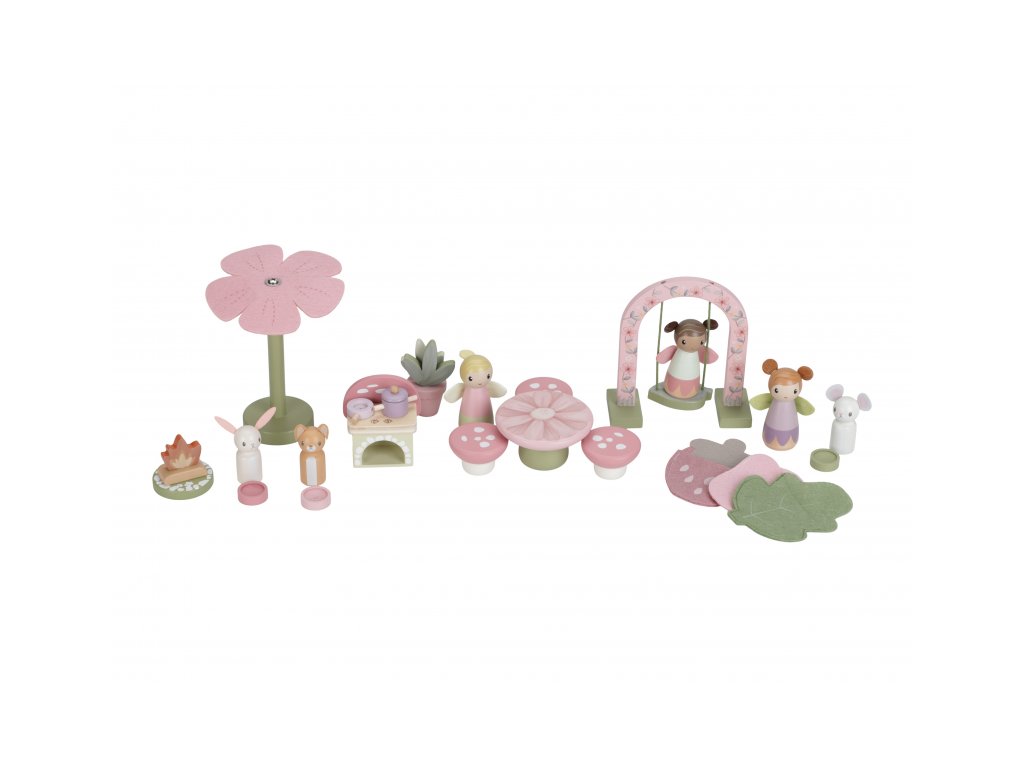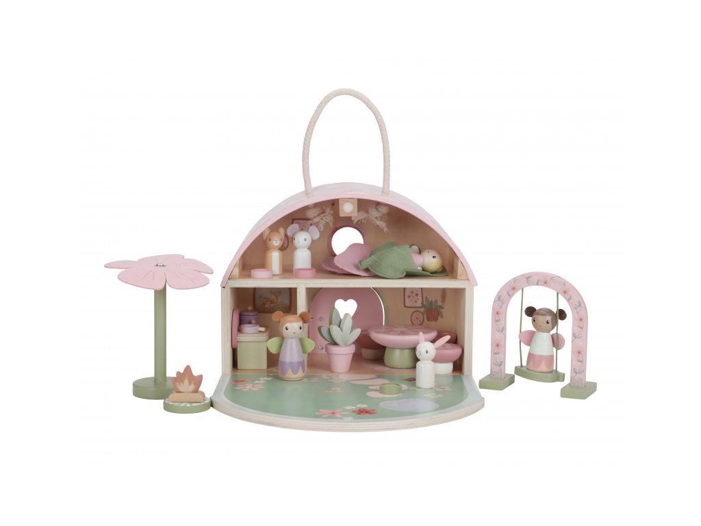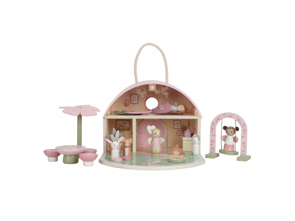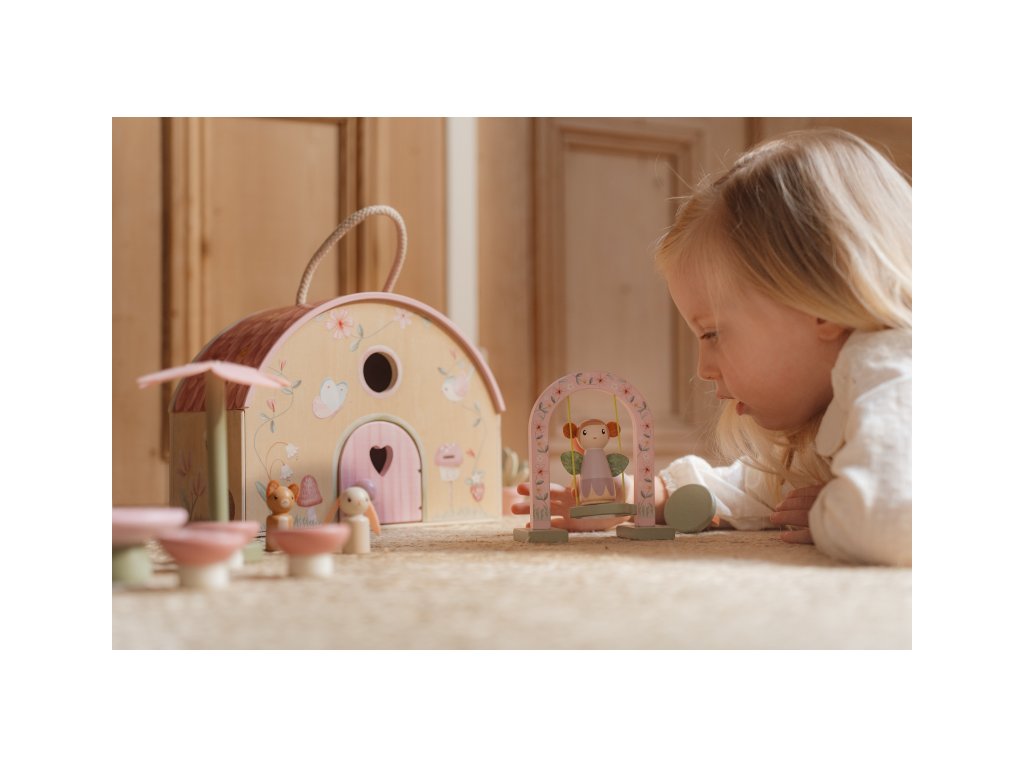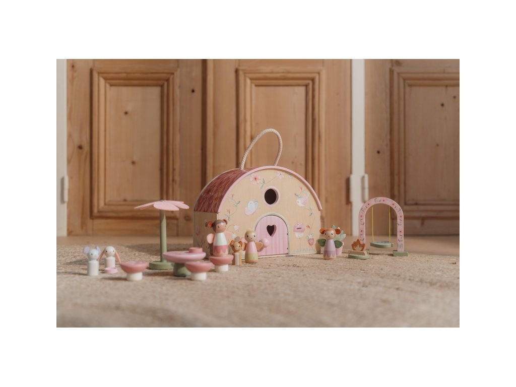 Dřevěný rozkládací domeček v sobě skrývá roztomilé dřevěné figurky víl a zvířátek, květinový slunečník, židličky se stolečkem, houpačku a mnoho dalších doplňků pro pořádání pikniku, relaxování a hraní.