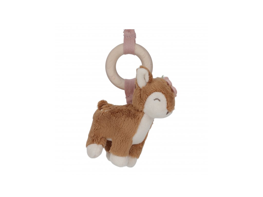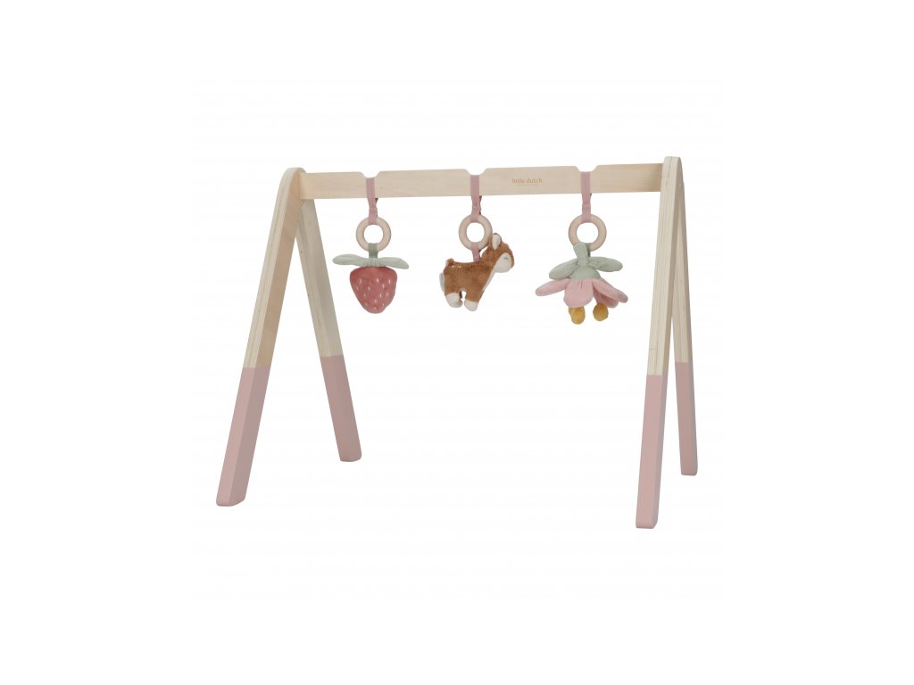 Stylová dřevěná hrazdička se třemi zavěšenými plyšovými hračkami v podobě srnky, jahůdky a kytičky poskytne vašemu miminku spoustu zábavy při hraní na dece. Jednotlivé hračky lákají dítě ke zkoumání a dotýkání, při pohybu chrastí a šustí. Hrazda je vyrobena z vysoce kvalitního odolného dřeva. Odnímatelné hračky je možné používat i samostatně. Hrazda je součástí designové kolekce hraček a doplňků Little Dutch Fairy Garden inspirované životem na zahradě. Rozměry: 48 x 60 x 54 cm Vhodné pro děti od narození.