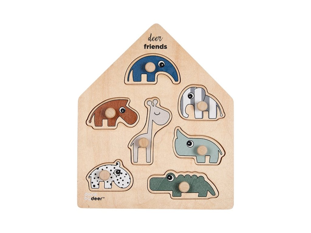 Dřevěné puzzle s obrázky jeleních zvířátek pomáhá rozvíjet motorické schopnosti batolat. 7 jeleních kamarádů tvoří dohromady roztomilé puzzle.