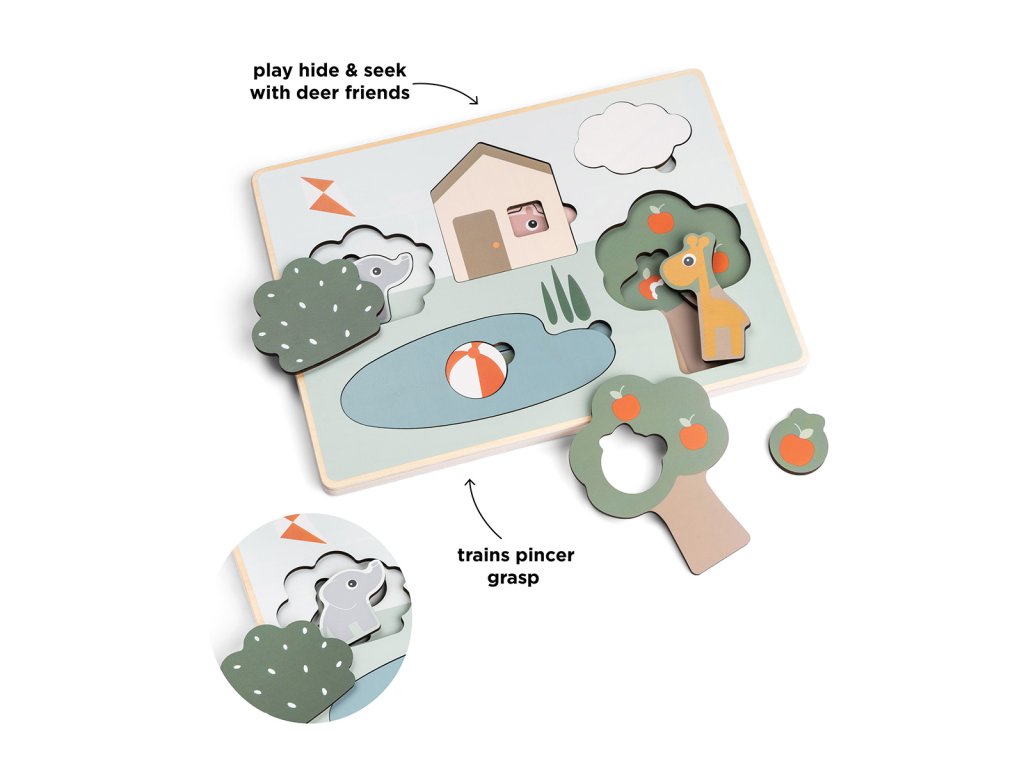 Trénujte jemnou motoriku a vašeho dítěte s roztomilými puzzlemi. Zvedněte obrázek a objevte co se skrývá pod stromkem nebo v domečku. Nechte své ratolesti zapojit fantazii a vymyslet si vlastní příběhy. Rozvíjí logické myšlení.