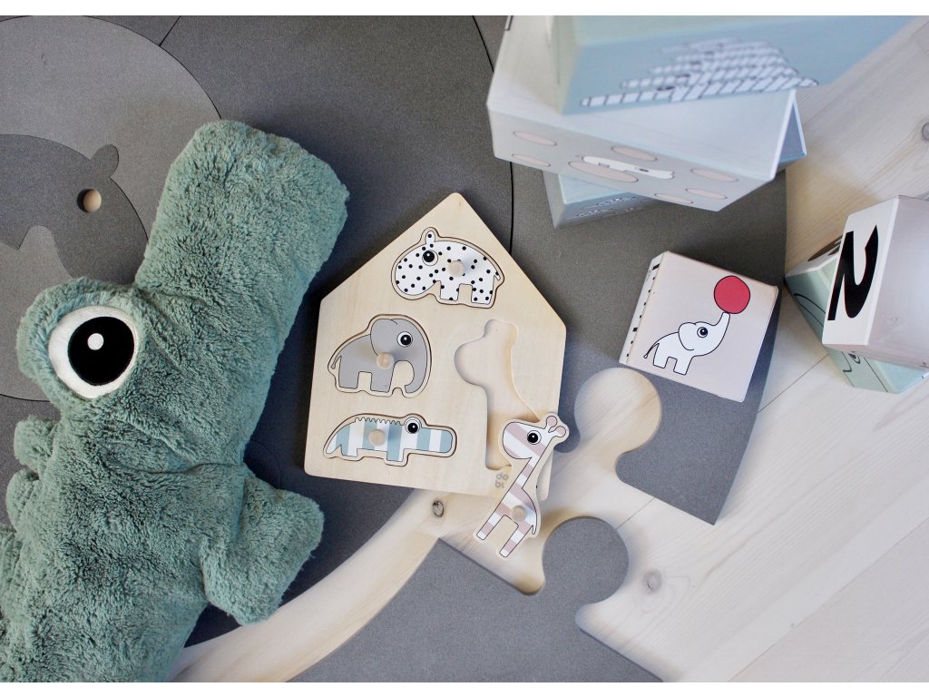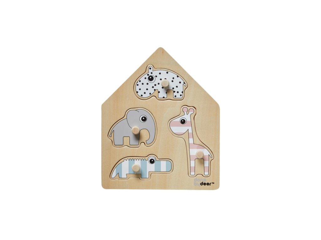 Dřevěné puzzle s obrázky jeleních zvířátek pomáhá rozvíjet motorické schopnosti batolat. Elphee, Croco, Ozzo a Raffi tvoří dohromady roztomilé puzzle.