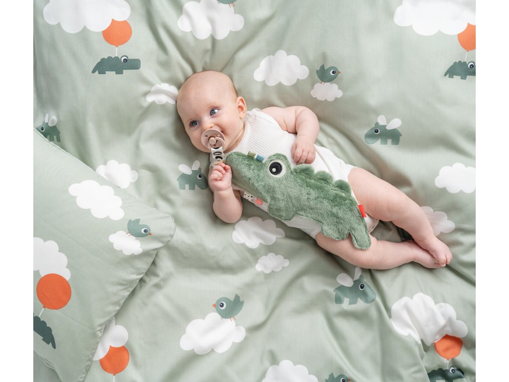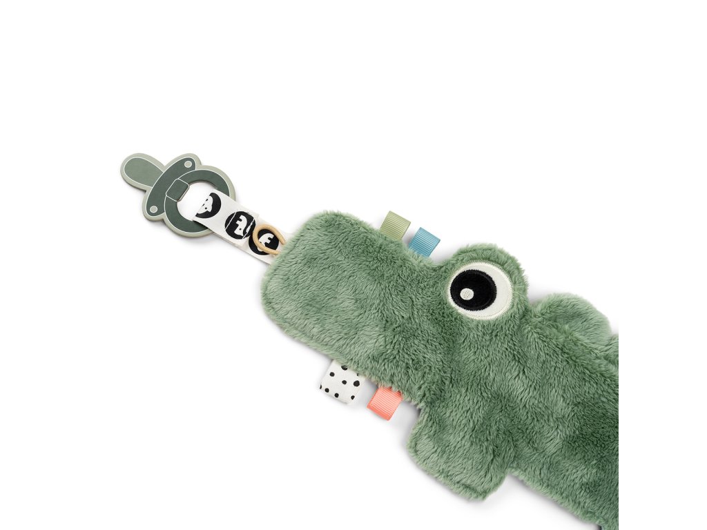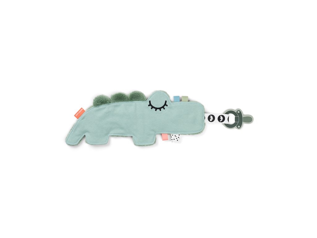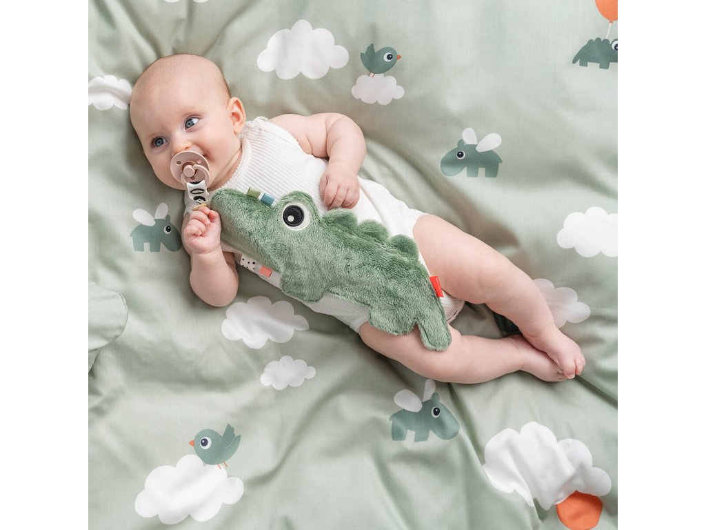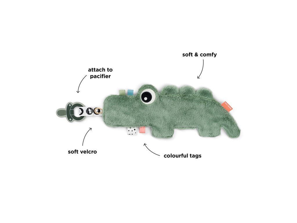 Měkká komfortní dečka Croco v zelené barvě, která poskytuje pohodlí pro vaše dítě. Zábavné textury, tvary a barevné značky pro stimulaci. Krokodýlí přítulka poskytuje super měkký a pohodlný povrch, kterého se můžete držet během spánku nebo hraní. Praktická spona na suchý zip a elastická smyčka umožňují připevnění dudlíku.