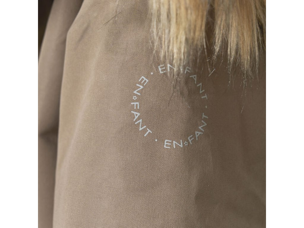 Kapuce lze odepnout, nebo lze odepnout jen kožešinový límec. Na rukávech je náplet s otvorem na prst a rukávy lze stáhnout suchým zipem.
