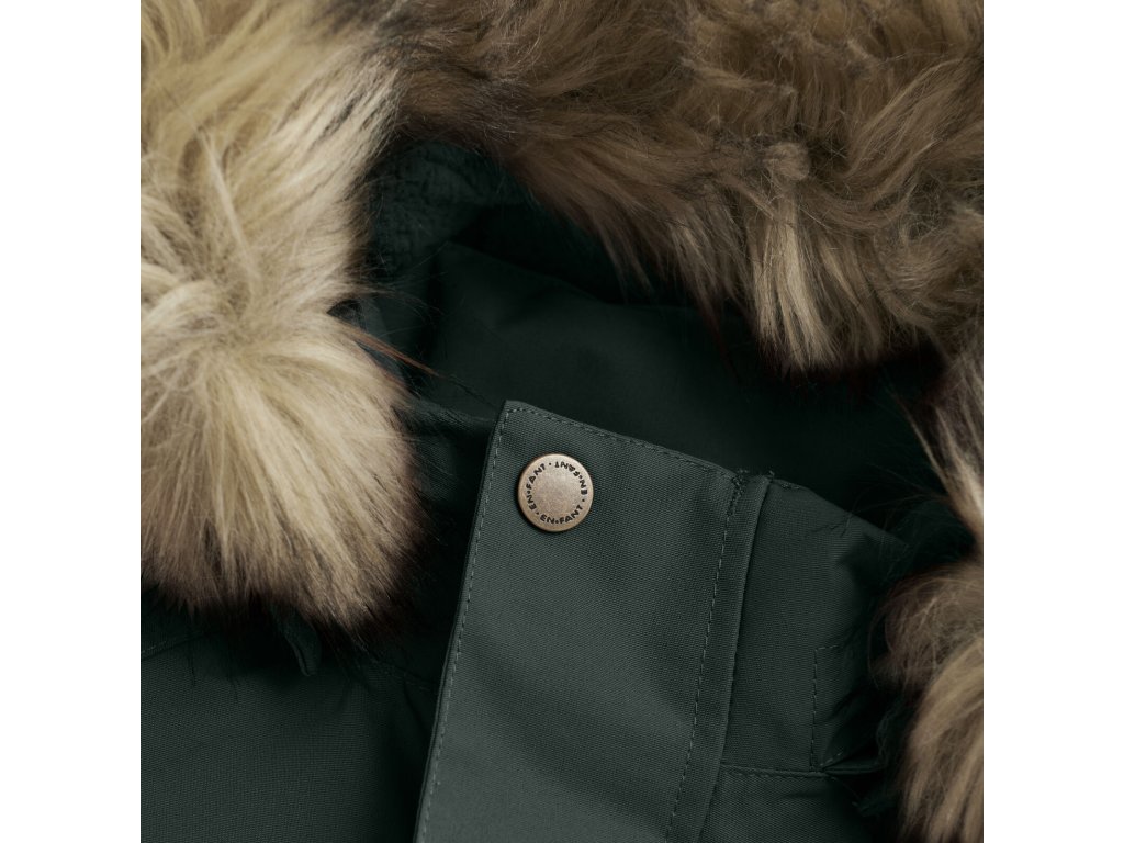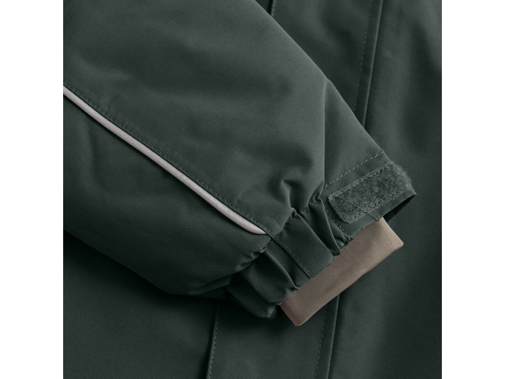 Kapuce lze odepnout, nebo lze odepnout jen kožešinový límec. Na rukávech je náplet s otvorem na prst a rukávy lze stáhnout suchým zipem.