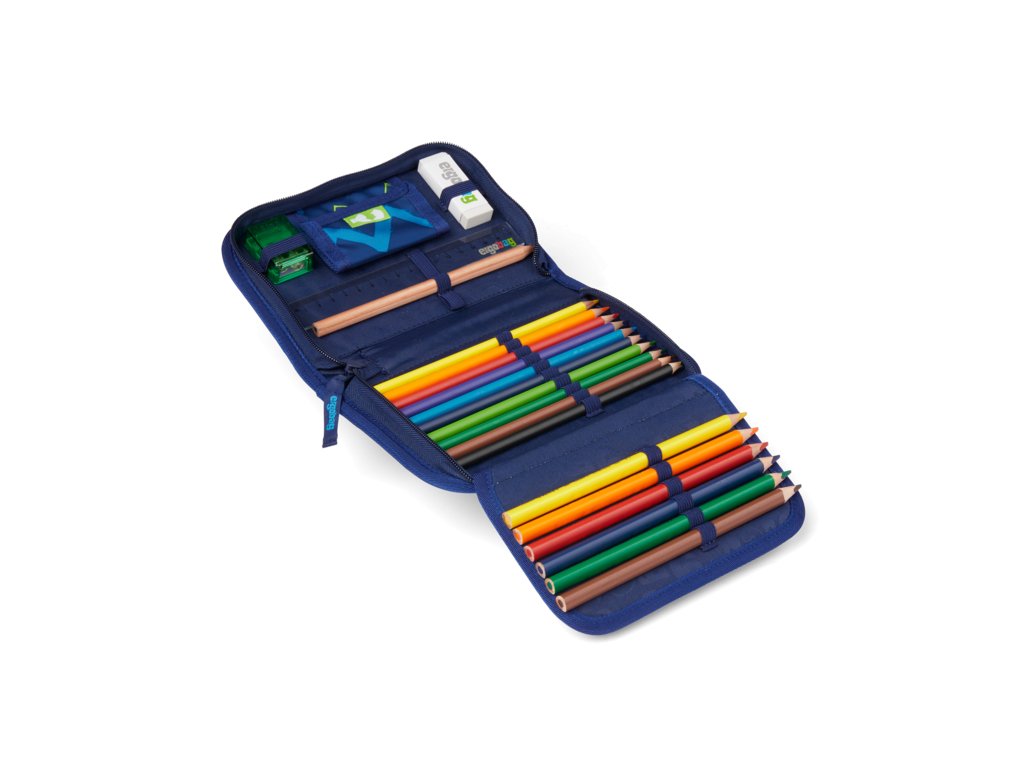 Penál Ergobag Black – 20 dílný, jednopatrový penál s chlopní na rozvrh hodin a malou kapsičkou. Součástí dvacetidílného setu jsou trojhranné pastelky a tužky produktové řady Lyra. Jejich speciální trojhranný tvar napomáhá správnému uchopení. Vnitřek penálu je tmavě modrý.