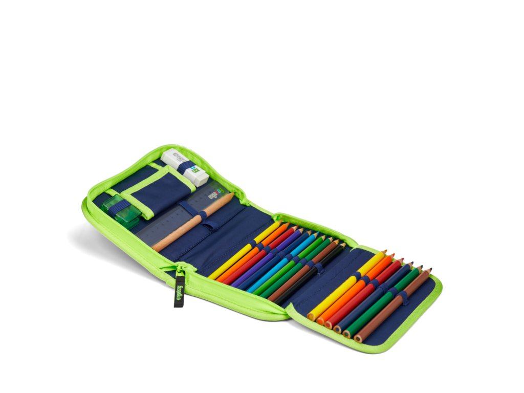 Penál Ergobag – 20 dílný, jednopatrový penál s chlopní na rozvrh hodin a malou kapsičkou. Součástí dvacetidílného setu jsou trojhranné pastelky a tužky produktové řady Lyra. Jejich speciální trojhranný tvar napomáhá správnému uchopení. Vnitřek penálu je tmavě modrý.