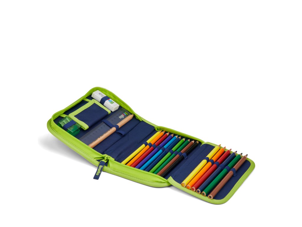 Penál Ergobag – 20 dílný, jednopatrový penál s chlopní na rozvrh hodin a malou kapsičkou. Součástí dvacetidílného setu jsou trojhranné pastelky a tužky produktové řady Lyra. Jejich speciální trojhranný tvar napomáhá správnému uchopení. Vnitřek penálu je tmavě modrý.