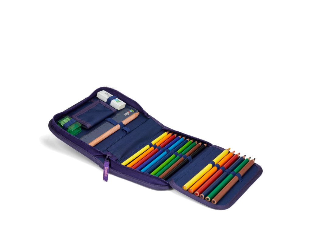 Penál Ergobag – 20 dílný, jednopatrový penál s chlopní na rozvrh hodin a malou kapsičkou. Součástí dvacetidílného setu jsou trojhranné pastelky a tužky produktové řady Lyra. Jejich speciální trojhranný tvar napomáhá správnému uchopení. Vnitřek penálu je tmavě modrý.