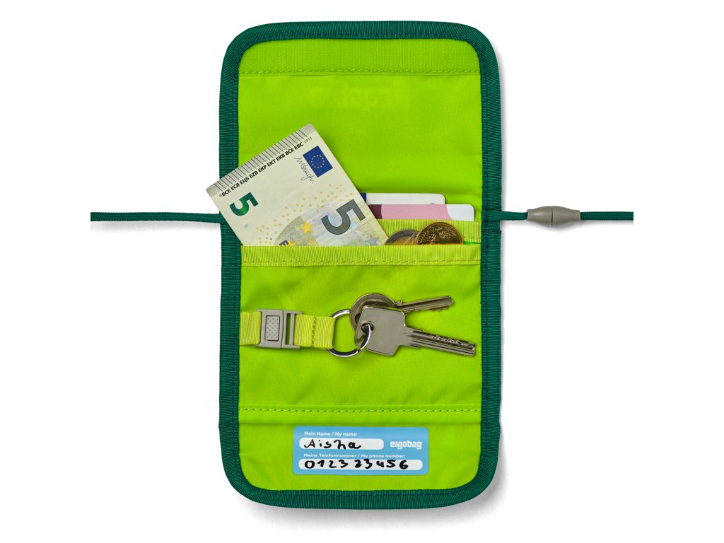 Multifunkční peněženka Ergobag je praktickým doplňkem každého školáka. 2 v 1 peněženka a klíčenka v jednom. Uvnitř je kroužek na klíče a prostor na bankovky či průkazky. Je uzavíratelná na suchý zip. V přední části je zip s kapsou na drobné mince. Zadní část má průhledné indexové okénko. Velmi praktická je šňůrka na krk s bezpečnostní přezkou, která se uvolní při působící síle více než 6 newtonů.