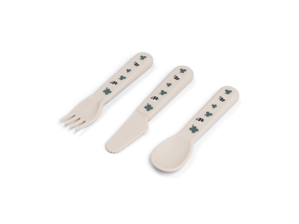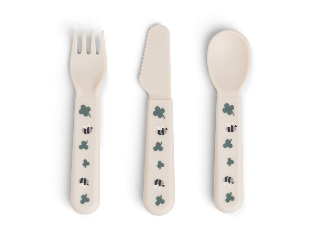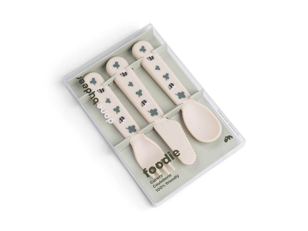 Sada příborů Foodie má měkké, zaoblené hrany, díky čemuž jsou bezpečné pro nejmenší, kteří si trénují jídlo sami. Příbory perfektně padnou do malých rukou a byly důkladně testovány dětmi. Roztomilá sada příborů pro miminka a batolata se skládá ze lžíce, vidličky a nože. Jakmile příbory doslouží svému účelu prostřednictvím bezpočtu rodinných večeří, lze je roztřídit jako plasty a recyklovat na nové produkty každodenního života. Krásná sada příborů pokrytá hravými čtyřlístky rozzáří každé jídlo. Jeho hedvábně matný povrch ladí se zbytkem kolekce Foodie.