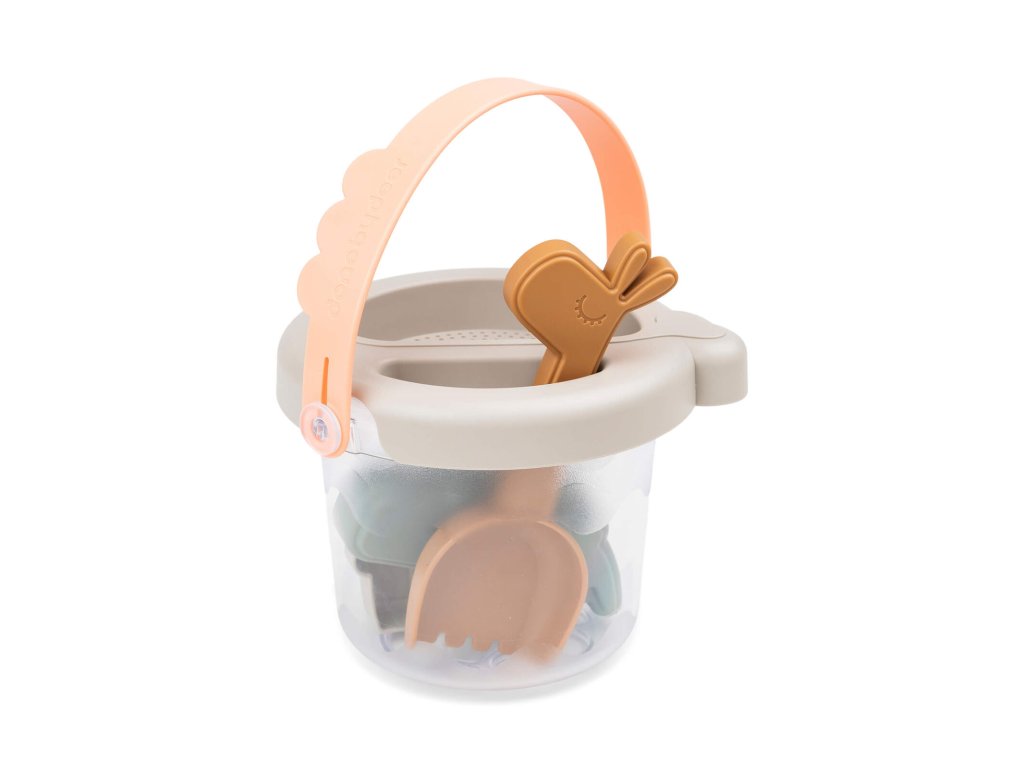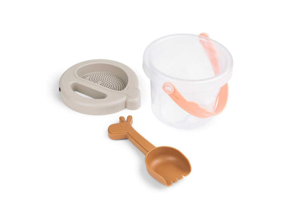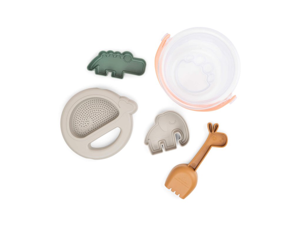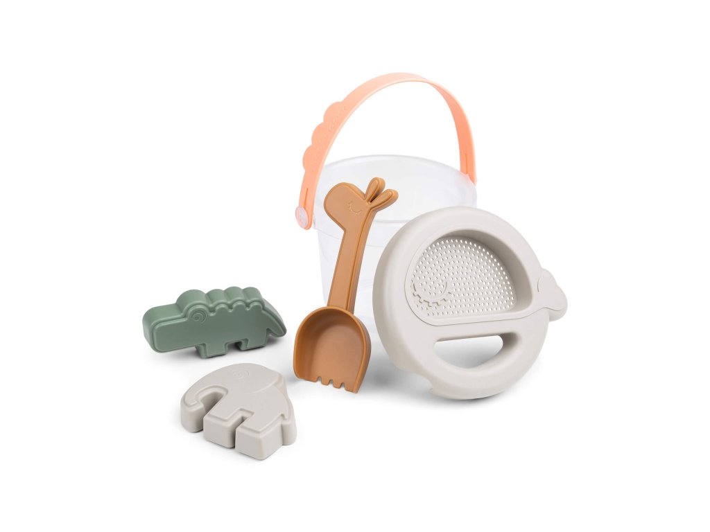 Hrací set na pláž a písek má 5 zábavných dílků a poskytne hodiny zábavy! Zabalte cool pískové formičky Croco a Elphee a lopatku Raffi do roztomilého kbelíku a vydejte se za písečnými dobrodružstvími na pláž, pískoviště nebo ji použijte v interiéru. Kbelík má zábavné víko Wally s uchem, které je zároveň sítkem – skvělé pro hledání pokladů v písku. Sada je vyrobena z PP a PS plastu ideální pro výrobu báboviček z písku, nošení vody. Dokonalá hrací sada pro všechna batolata s formičkou krokodýla a slona, lopatkou ve tvaru žirafy, velrybím sítkem a průhledným kyblíkem zdobeným vlnkami a tlapkou.