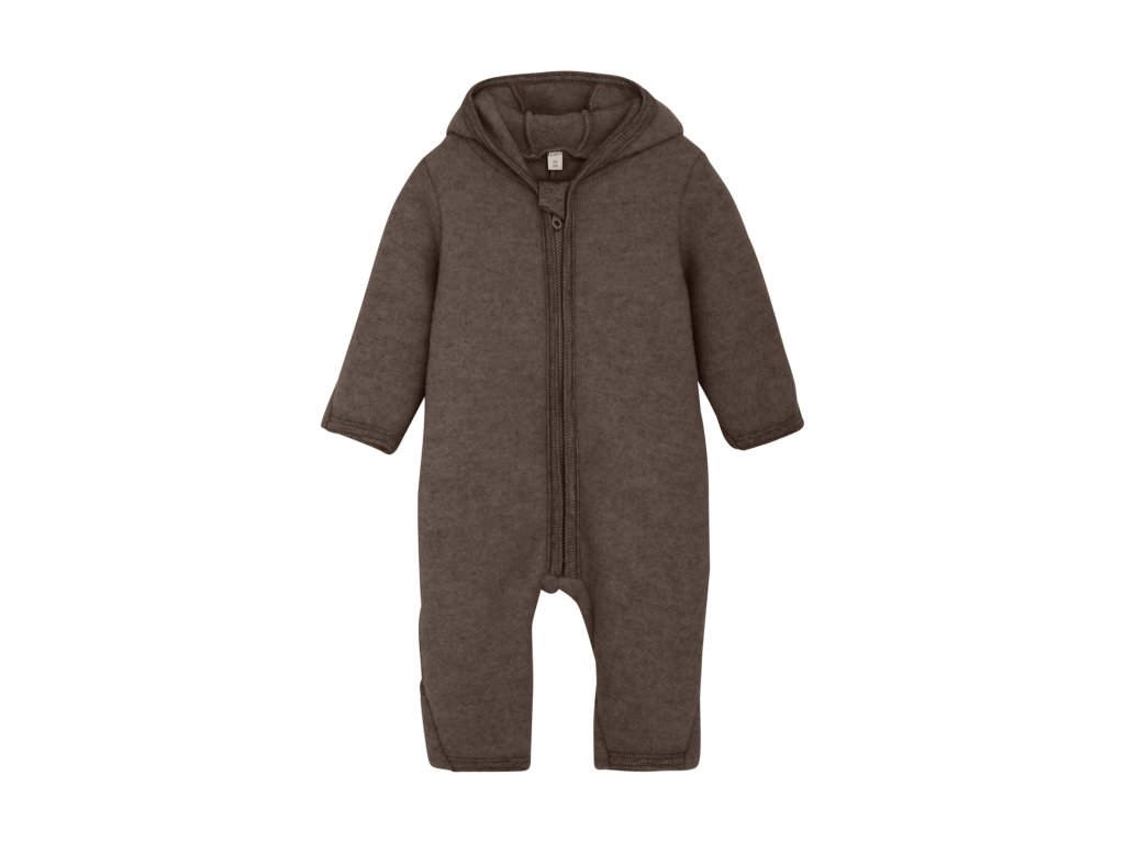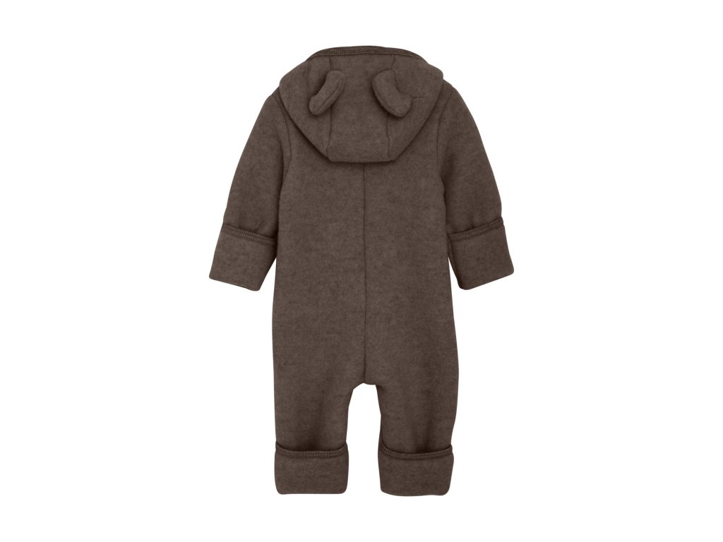 Overal z vlněného fleesu s medvědími oušky, má na rukávech i nohavicích přehrnovací "rukavičky". (do velikosti 74, pak už nemá)