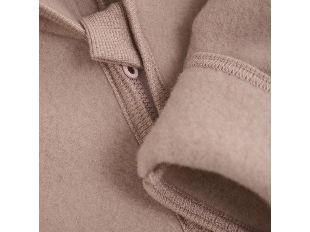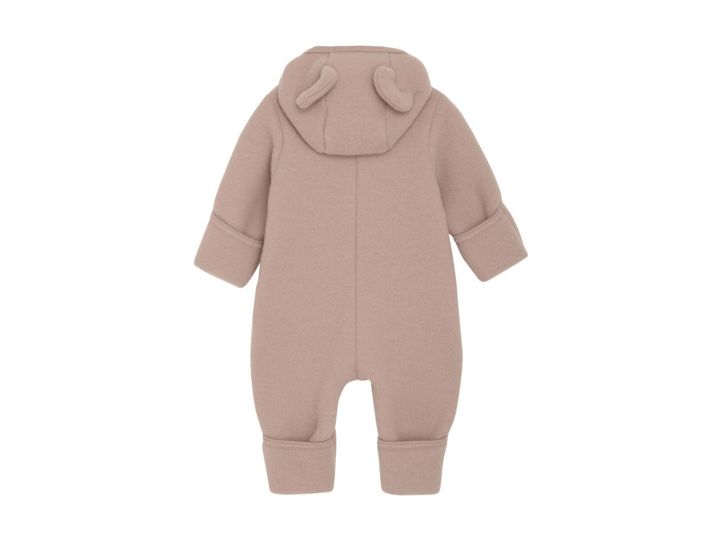 Overal z vlněného fleesu s medvědími oušky, má na rukávech i nohavicích přehrnovací "rukavičky". (do velikosti 74, pak už nemá)