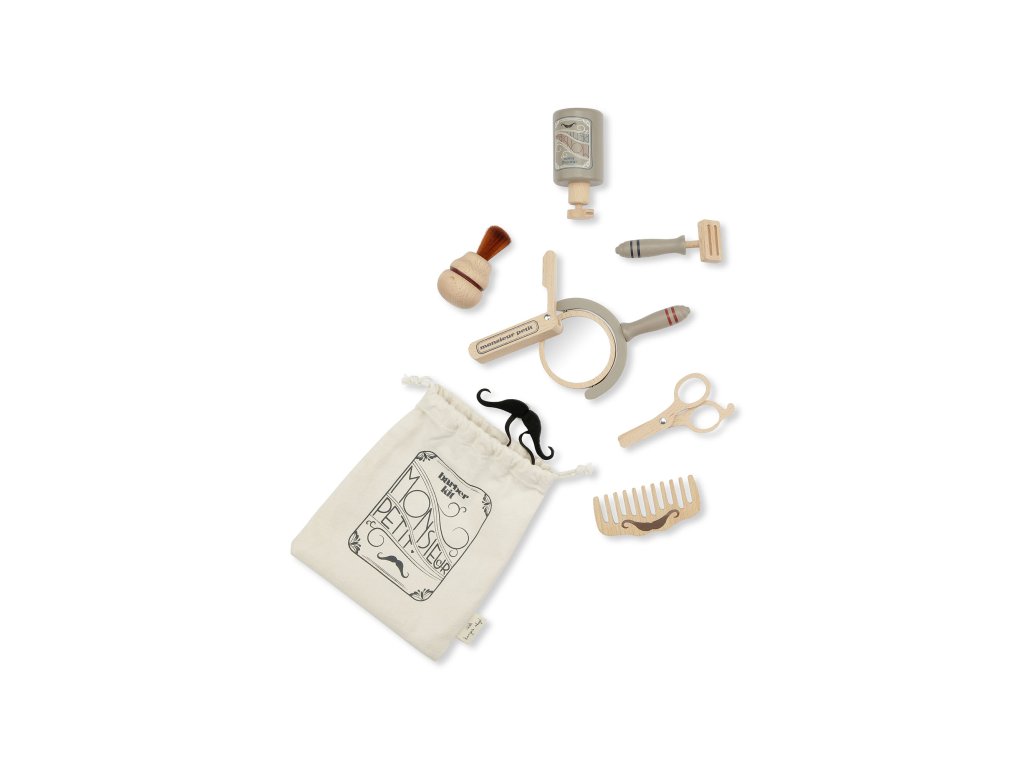 Obsahuje 8 dílů: nůžky, holicí strojek, lahvičku s pěnou na holení, kartáč, hřeben, zrcátko, holičský nůž a knírek. Baleno v krásném v sáčku z organické bavlny