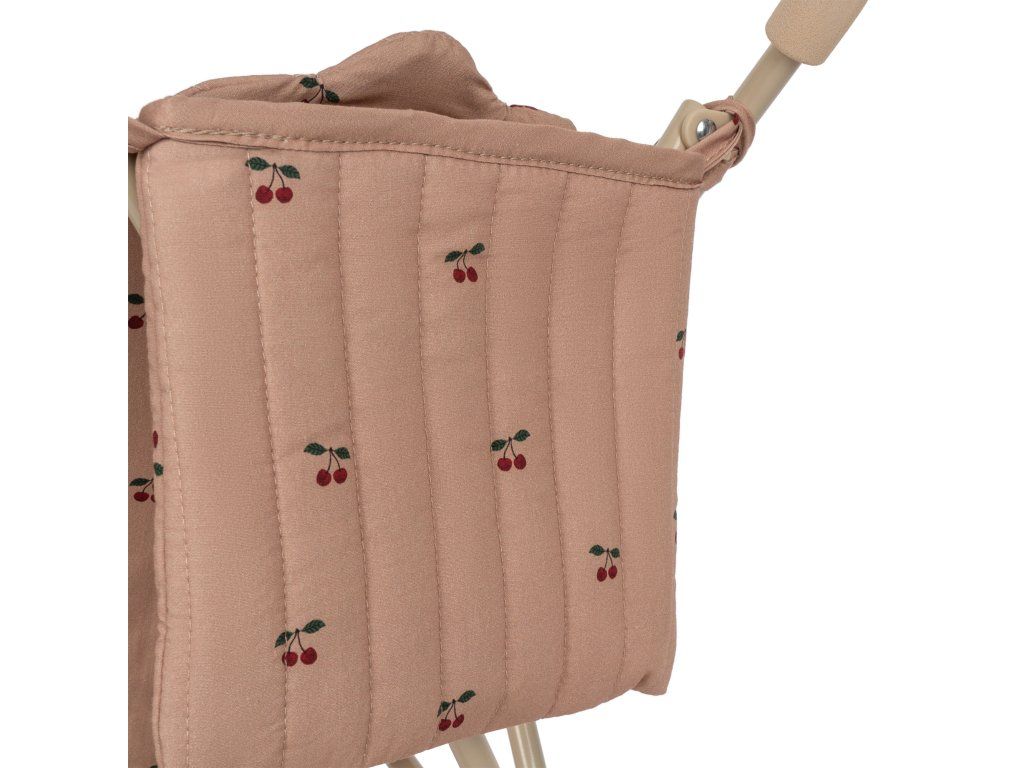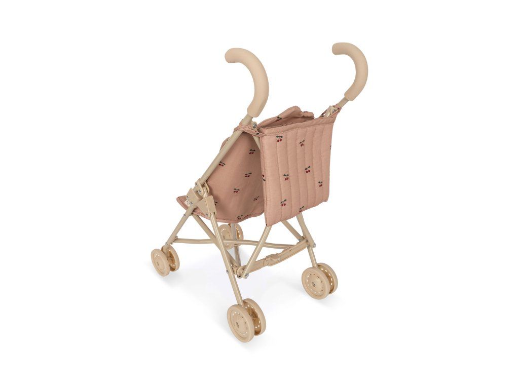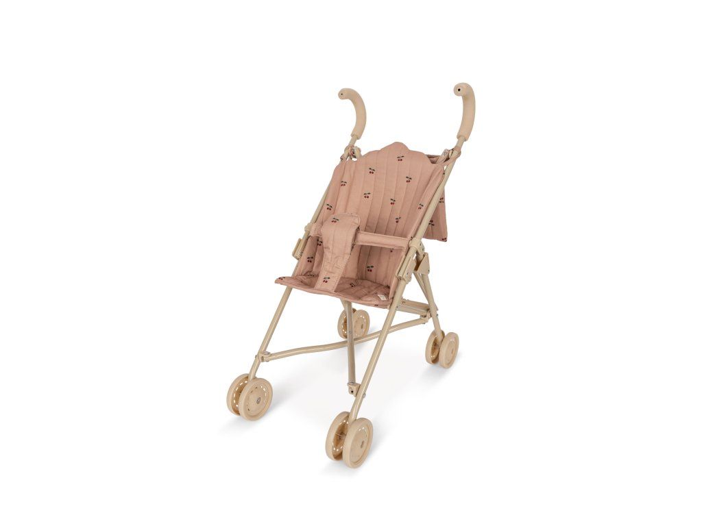 Kočárek pro panenky navržený s postrojem, taškou a dvojitými koly na všech čtyřech nohách pro extra stabilitu.