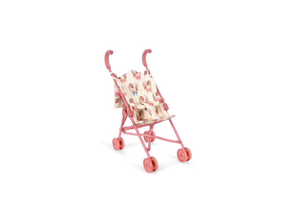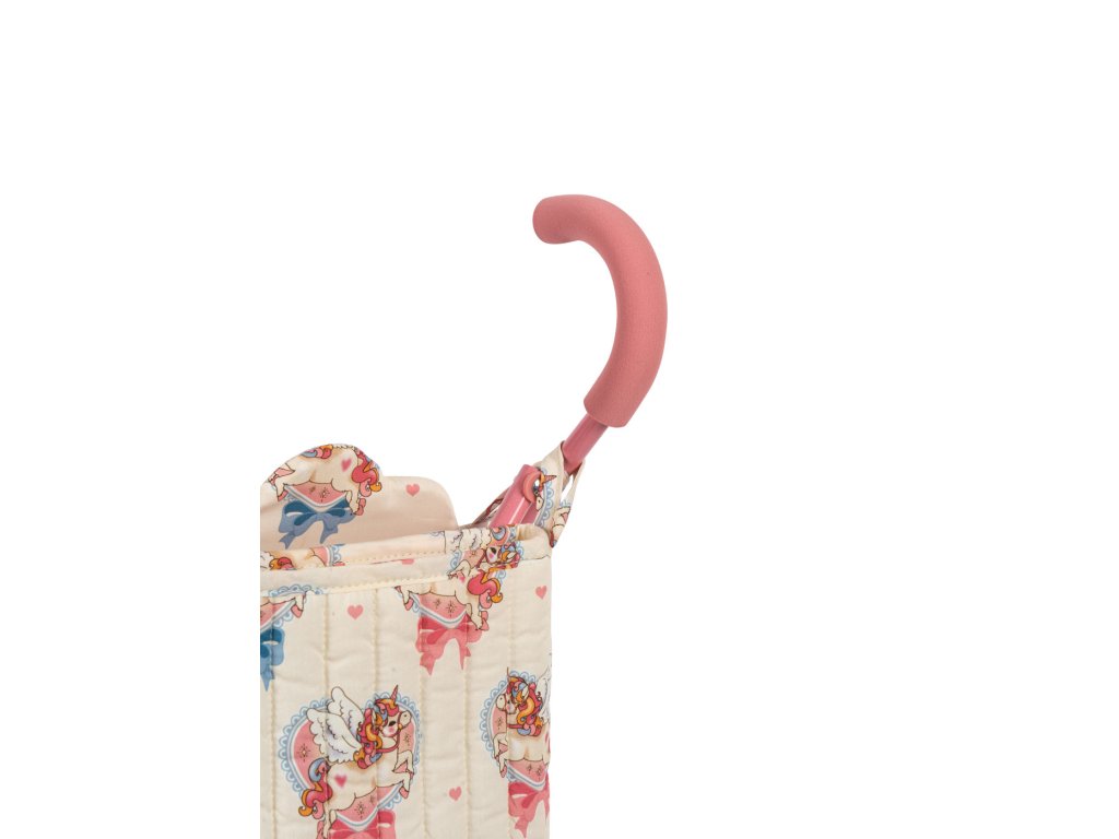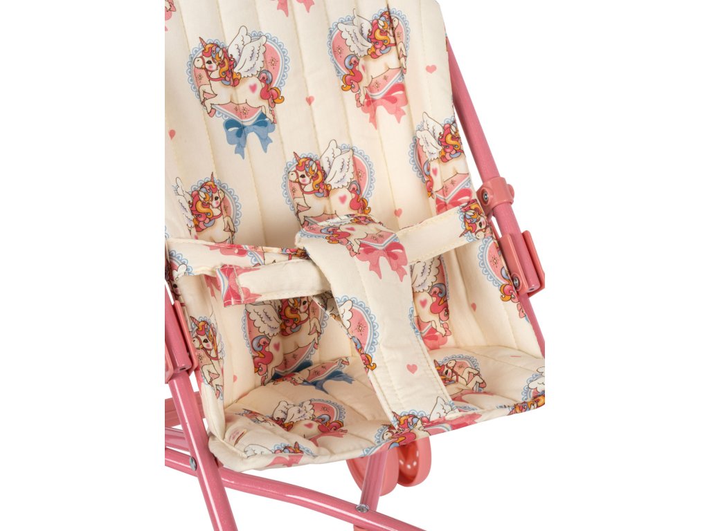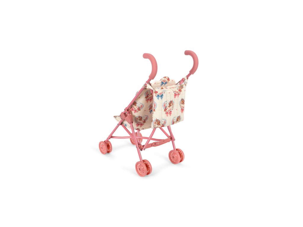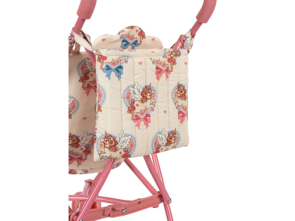 Kočárek pro panenky s postrojem, taškou na přenášení a dvojitými kolečky na všech čtyřech nohách pro větší stabilitu.