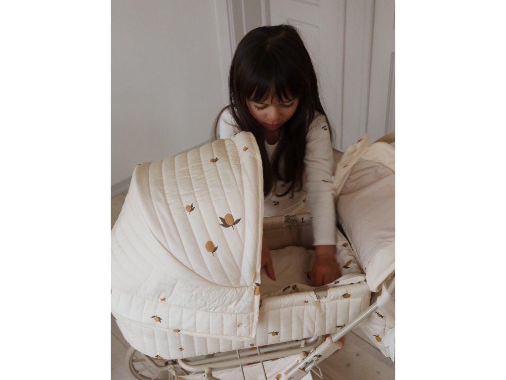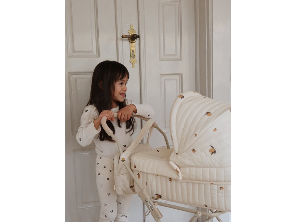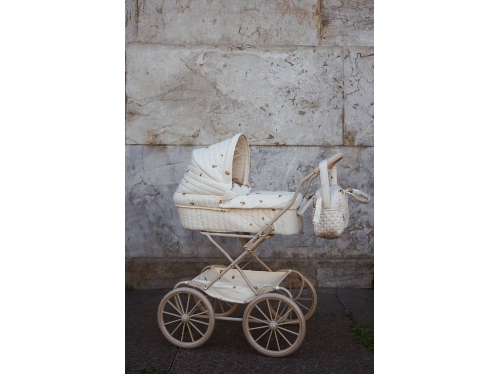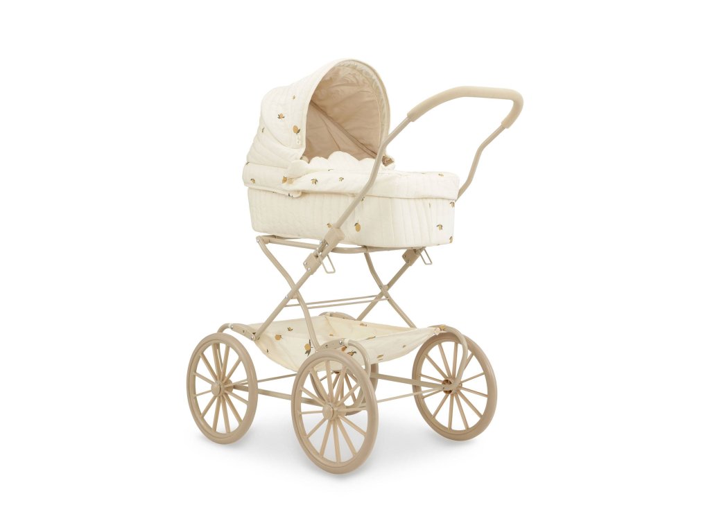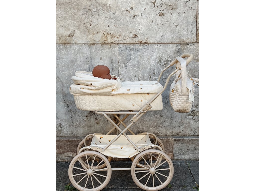 Dětský kočárek ve vintage stylu navržený se čtyřmi velkými koly. Má prošívanou látku, jemné vlnité okraje a polstrovanou matraci. Pod kočárkem se nachází měkký úložný koš. Rám je vyroben z kovu s měkkými, houbovitými držadly pro snadné uchopení.