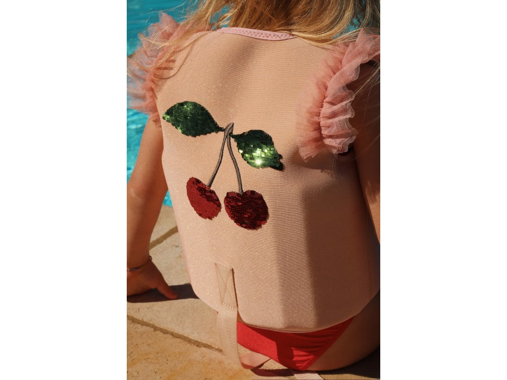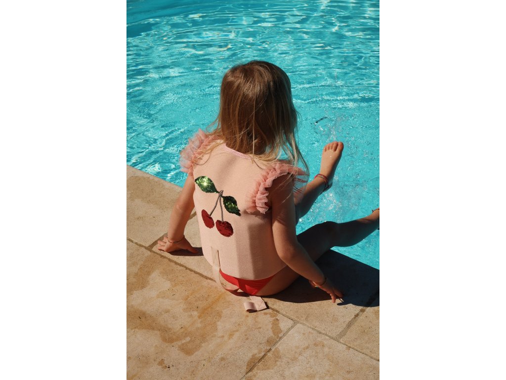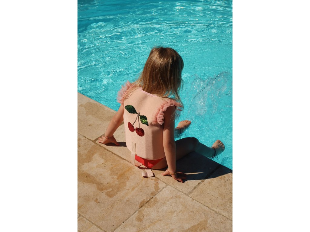 Vesta je vyrobená z 80% neoprenu a 20% polyesterové podšívky. Pro snadné oblékání je zavržena se zapínáním na zip a suchý zip. Obsahuje bezpečnostní pásek v rozkroku s přezkou, takže vaše dítě nikdy nemůže z vesty vyklouznout.
