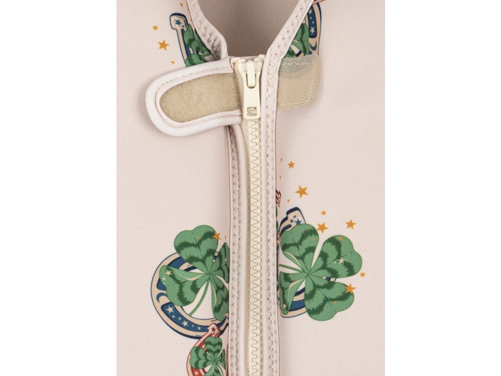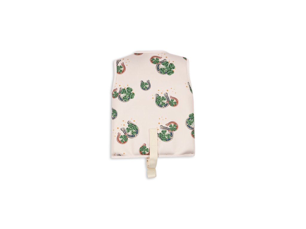 Vesta je vyrobená z 80% neoprenu a 20% polyesterové podšívky. Pro snadné oblékání je zavržena se zapínáním na zip a suchý zip. Obsahuje bezpečnostní pásek v rozkroku s přezkou, takže vaše dítě nikdy nemůže z vesty vyklouznout.