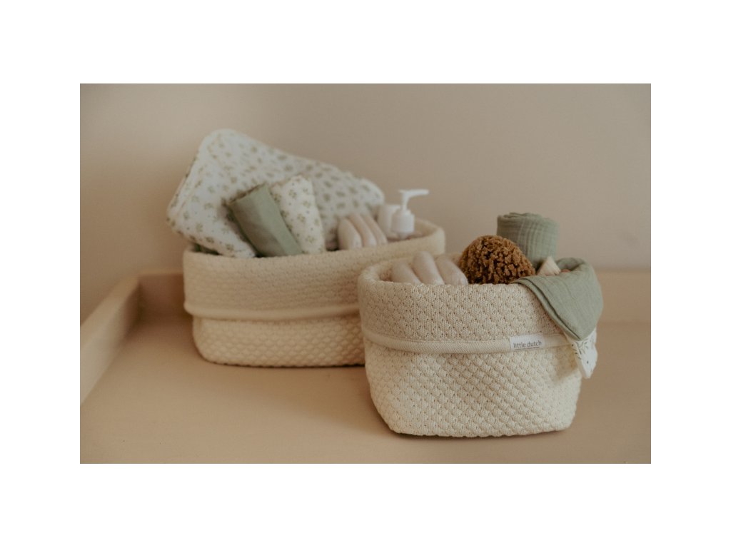 Košík v krásném pleteném provedení je vyroben z pevného bavlněného materiálu. Využijete jej pro přehledné uložení všeho, co potřebujete mít po ruce při každodenní péči o vaše miminko. Ohrnovací okraj umožňuje přizpůsobit výšku košíku vašim potřebám. Košík bude zároveň krásným doplňkem na přebalovacím pultu či poličce v dětském pokoji. Složení: 100% organická bavlna, uvnitř 100% bavlna s LDPE zátěrem Rozměry: 15 x 15 x 15 cm