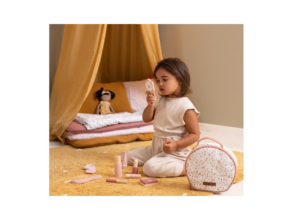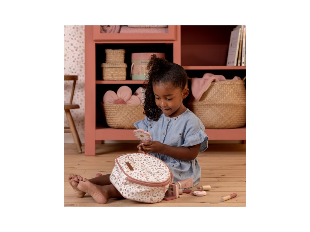 Kosmetická taštička na zip s krásným květinovým vzorem v sobě skrývá kompletní kosmetickou výbavu pro vaši malou parádnici. V taštičce najdete ruční zrcátko, lahvičku s parfémem, tubu s krémem, rtěnku, lak na nehty, pudr na obličej, labutěnku, oční stíny, řasenku a pilník na nehty. Vše v krásném dřevěném provedení, které je zárukou dlouhé životnosti a hraní bez nepořádku. Rozměry: 21 x 21,7 x 9 cm Vhodné pro děti od 3 let.Doplňkové parametry