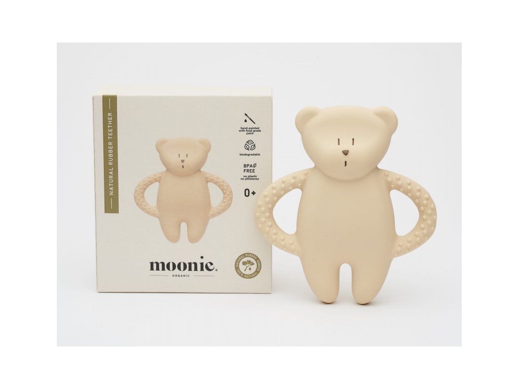 Kousátko MOONIE podobě roztomilého medvídka z přírodního kaučuku bylo pečlivě navrženo tak, aby zklidnilo bolavé dásně během prořezávání zoubků a zároveň poskytovalo bezpečný a příjemný smyslový zážitek. Tvar a velikost kousátka umožňují snadné držení malými dětskými ručičkami, různorodé textury lákají dítě ke zkoumání. Hračka je ručně malovaná netoxickými potravinářskými barvami. Kousátko z přírodního kaučuku je přirozeně odolné vůči bakteriím a plísním a snadno se čistí, stačí jej omýt teplou vodou a jemným mýdlem. Kousátko je plně biologicky odbouratelné. S ohledem na udržitelnost životního prostředí je výrobní proces hračky certifikovaný podle standardů FSC a GOLS. Neobsahuje BPA, ftaláty ani nitrosaminy. Rozměry: 12 x 12 cm Vhodné pro děti od narození.
