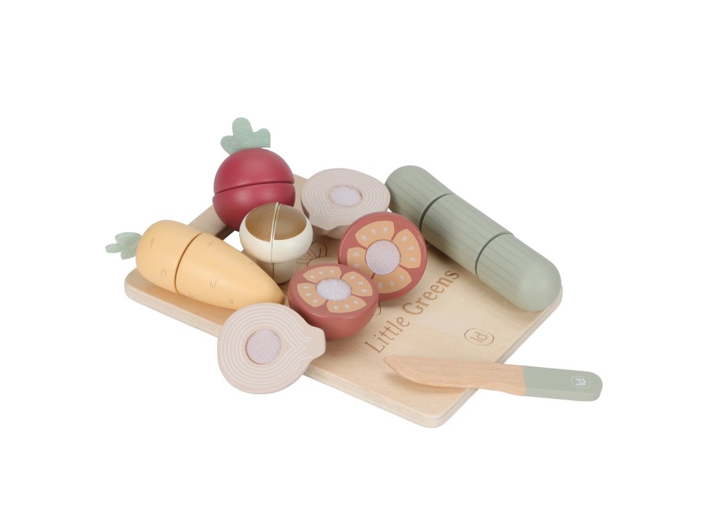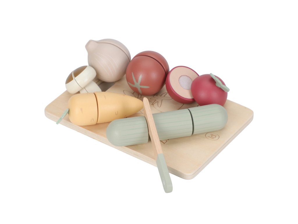 Vařte jako profík a učte se jíst zeleninu hrou! Tato sada dřevěné krájecí zeleniny podporuje dětskou představivost, jemnou motoriku i chuť ke zdravému jídlu. Sada obsahuje mrkev, okurku, rajče, cibuli, červenou řepu a žampion – všechny druhy zeleniny lze dřevěným nožem rozkrojit napůl a díky suchému zipu je snadno spojíte zpět.