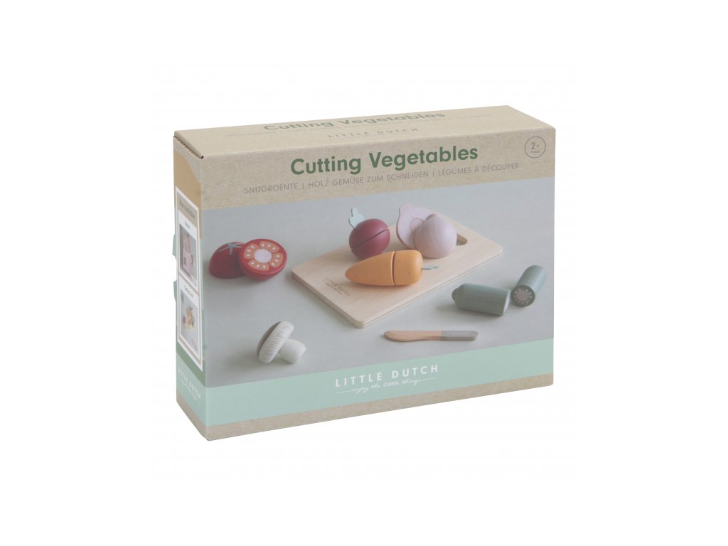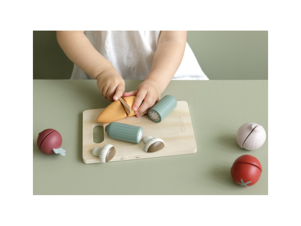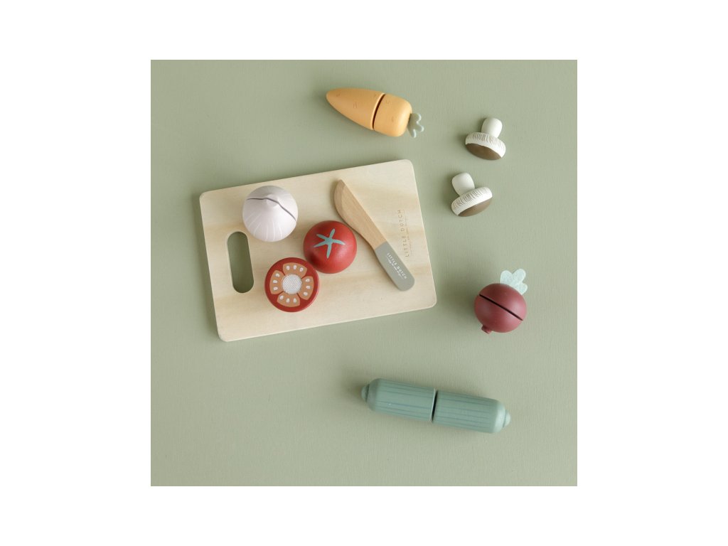 Zeleninu je potřeba před vařením nakrájet, to ví každý malý kuchař i kuchařka. Tato dřevěná sada obsahuje 6 druhů zeleniny (mrkev, okurku, hříbek, rajče, cibuli a červenou řepu), dřevěný nožík a krájecí prkénko. Každý kousek zeleniny je možné rozdělit na dva kusy a opět spojit pomocí suchého zipu. Rozměry: 21 x 16,7 x 6 cm Vhodné pro děti od 2 let.