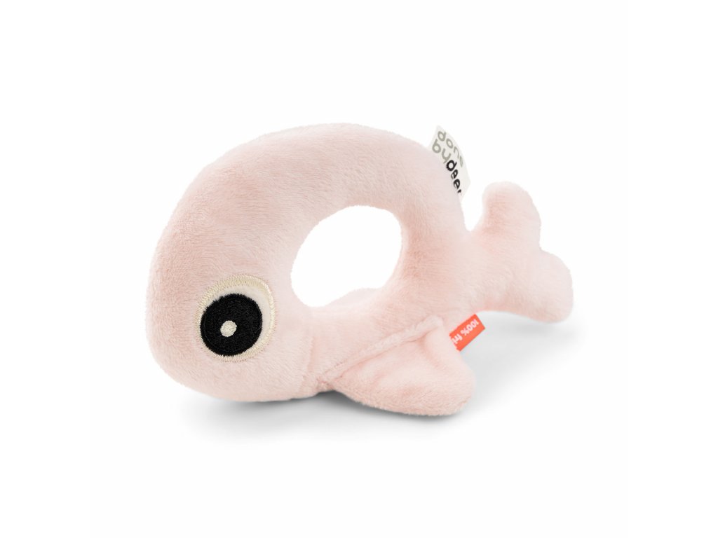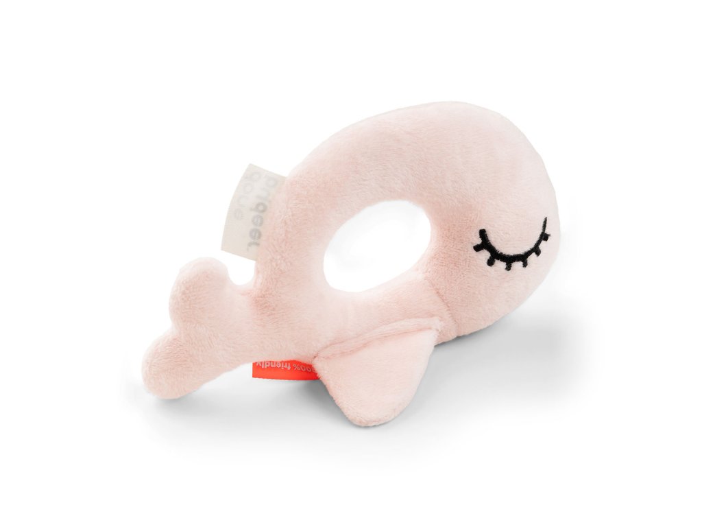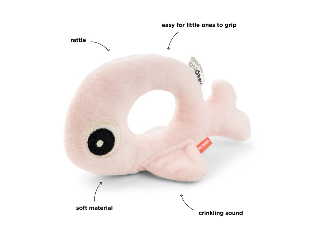 Měkké kroužkové chrastítko vydává roztomilý chrastivý zvuk když s ním zatřesete, a ploutve při dotyku vydávají legrační zvuk šustění. Ploutve umožňují, aby chrastítko stálo samo a bylo vhodné pro trénink na bříšku.