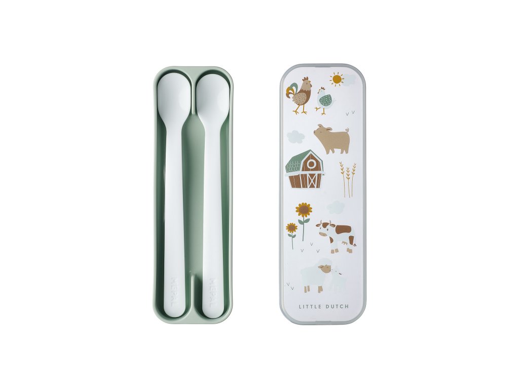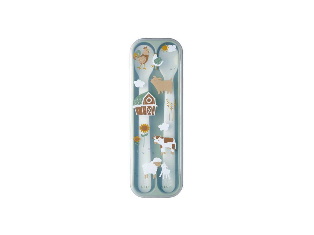 Plastové lžičky s dlouhou rukojetí jsou ideální pro první příkrmy. Mělké a úzké zakončení lžičky usnadňuje krmení miminka, dlouhá rukojeť umožňuje rodiči nabírání příkrmu i ze skleničky bez znečištění rukou. Praktické pouzdro umožňuje hygienické přenášení lžiček např. v přebalovací tašce. Lžičky jsou součástí designové kolekce hraček a doplňků pro děti Little Dutch Farma. Délka lžičky: 14,5 cm Materiál: PP, neobsahuje BPA Možno mýt v myčce. Vhodné pro děti od 4 měsíců.