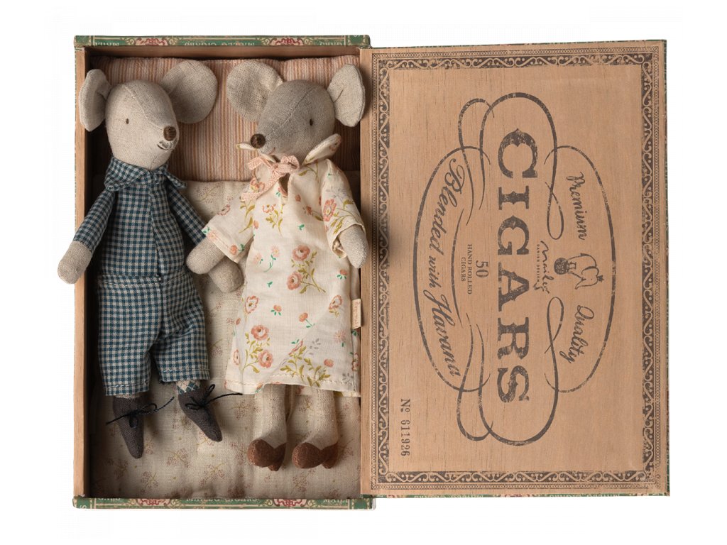 Babička s dědou v krabičce od kubánských doutníků jsou připraveni do hajan. Babička má noční košili a děda pyžamo.