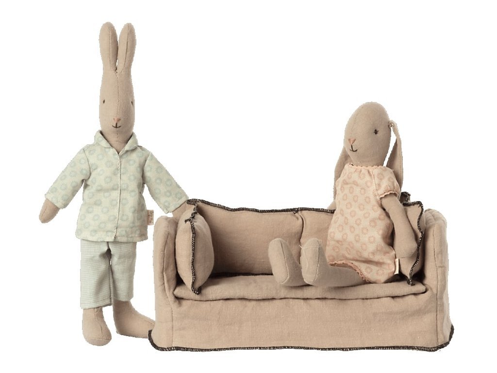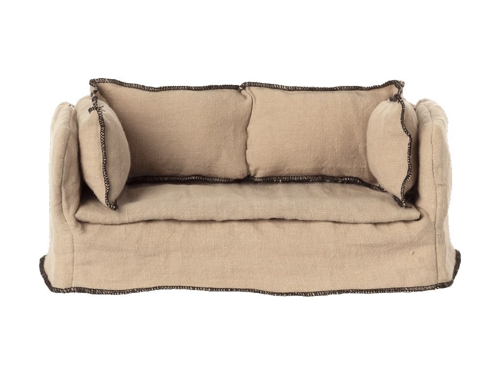 Gauč se lněným potahem perfektně sedí ke konferenčnímu stolku velikosti Mini a spolu skvěle doplní domeček pro myšky.