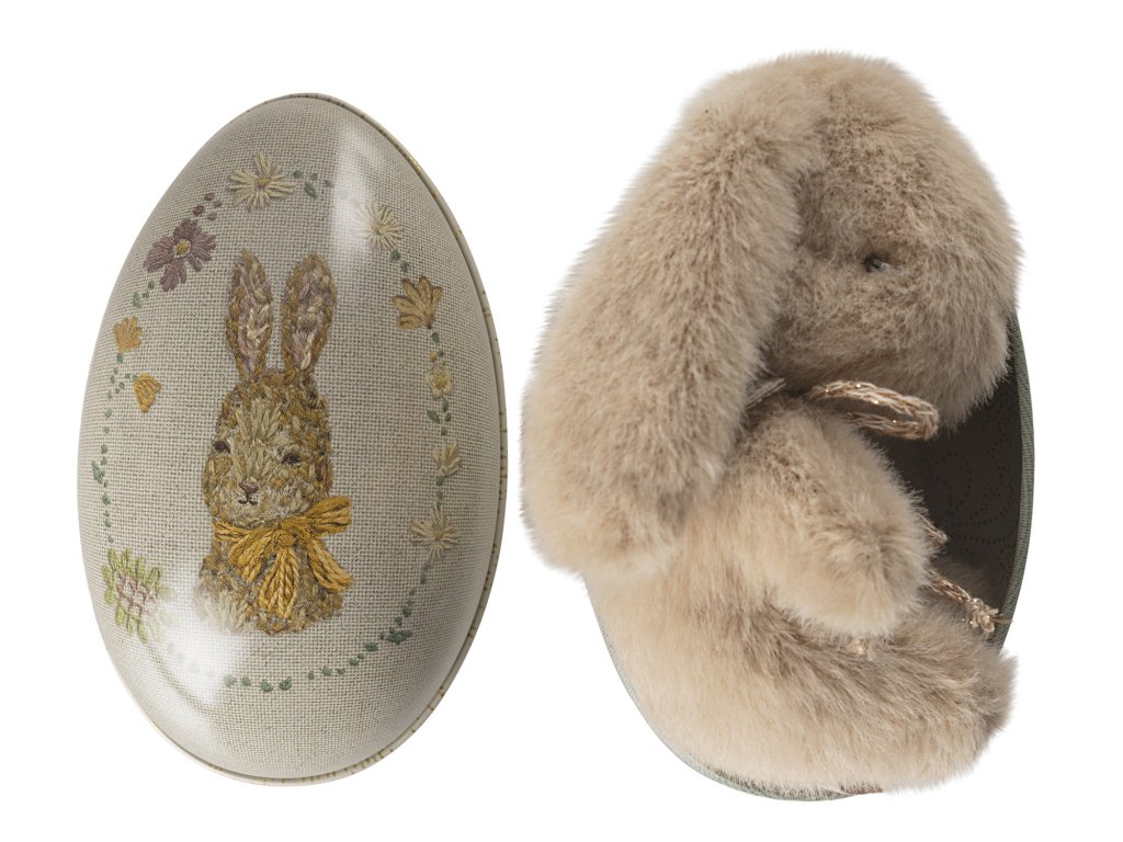 Hebký králíček,který perfektně pasuje do kovového vajíčka.