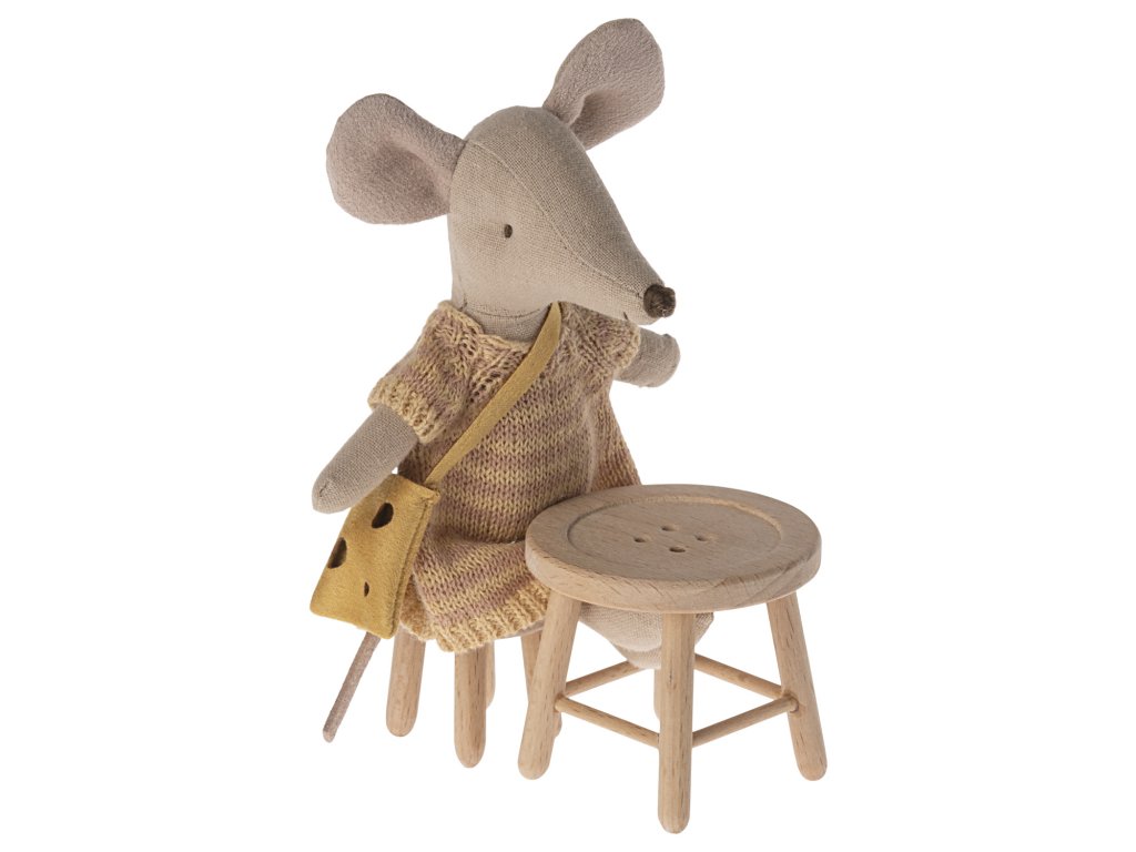 Židle a stůl pro myší rodinku. Velký knoflík jako stůl a menší jako knoflík bude ideální pro myší odpočinek a vykouzlí v domečku příjemnou atmosféru.