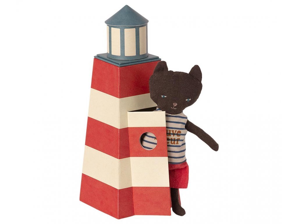 Maileg kocour záchranář v plážovém majáku. Vršek majáku lze snadno otočit, vznikne tak posezení.Žádné z příslušenství není voděodolné, plavat ve vodě může jen ve vaší představivosti.
