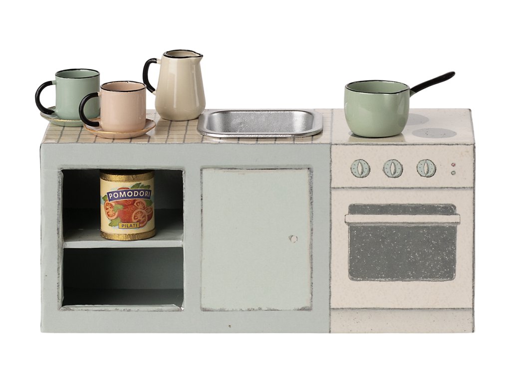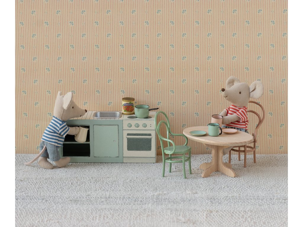 Malý kuchyňský stůl přichází se 2 hrnky a 2 talíři, jedním hrncem a konvicí a jednou malou krabičkou.