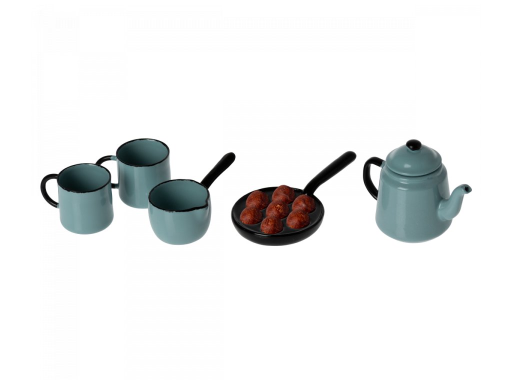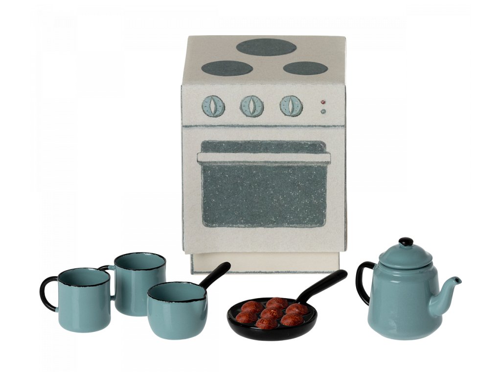Miniaturní sada na vaření se všemi oblíbenými produkty Madam Blue. Plechovka a dva šálky, rendlík a pánev s lahodnými listovými koláčky, což je tradiční skandinávská pochoutka v zimním období. Všechny tyto části jsou dodávány v papírové krabici, která vypadá jako sporák.
